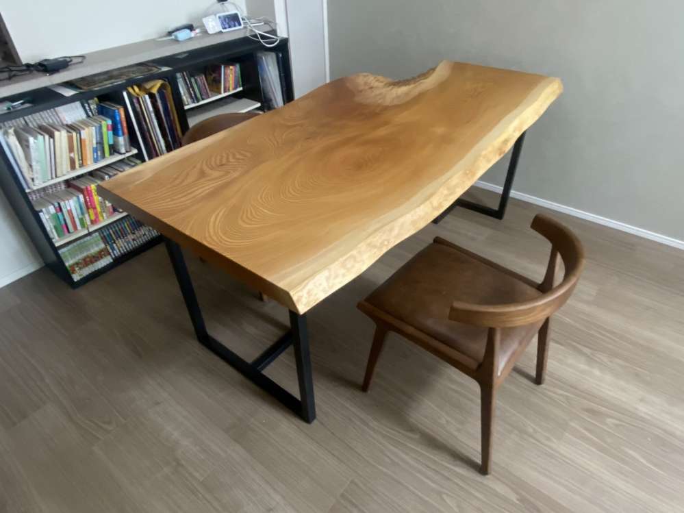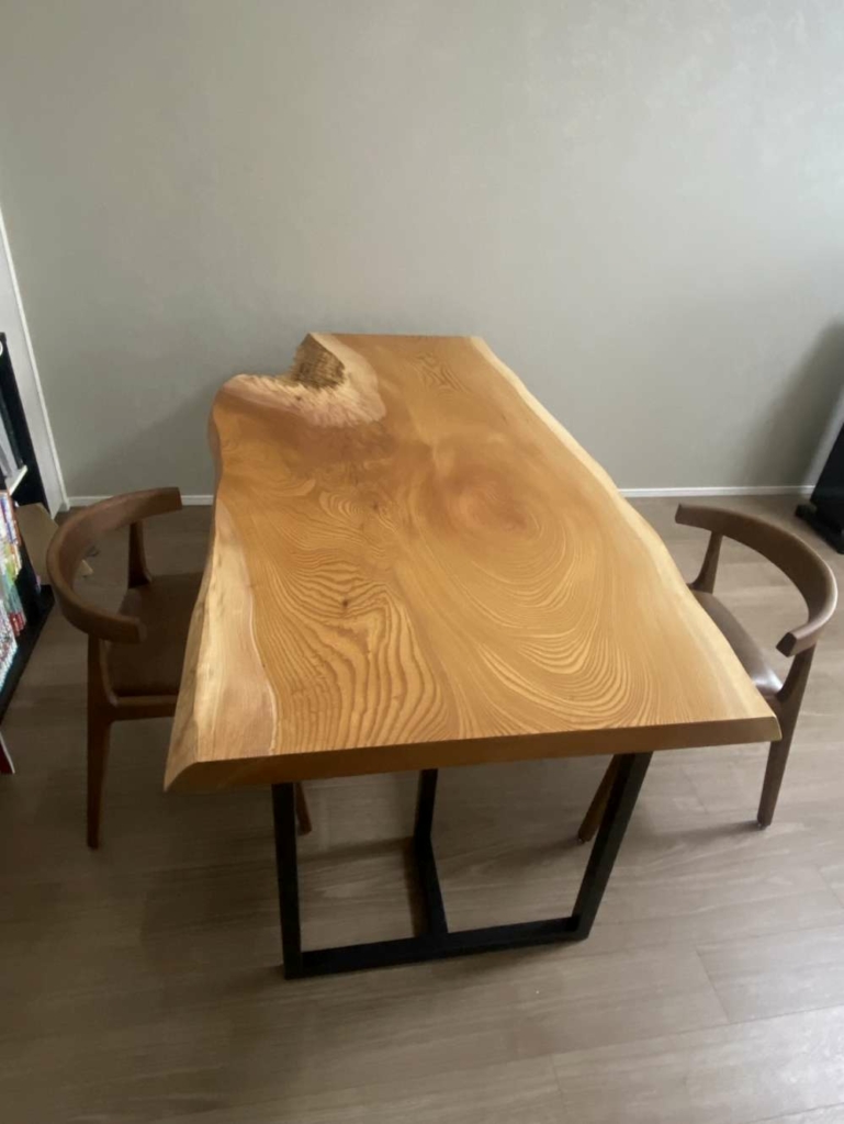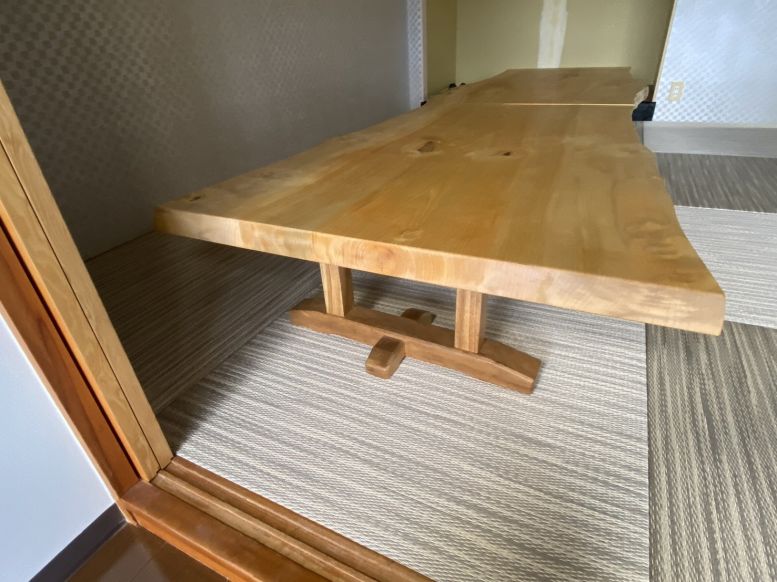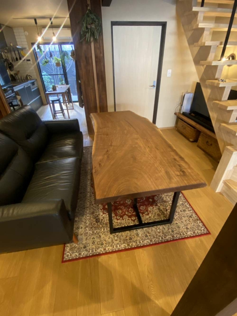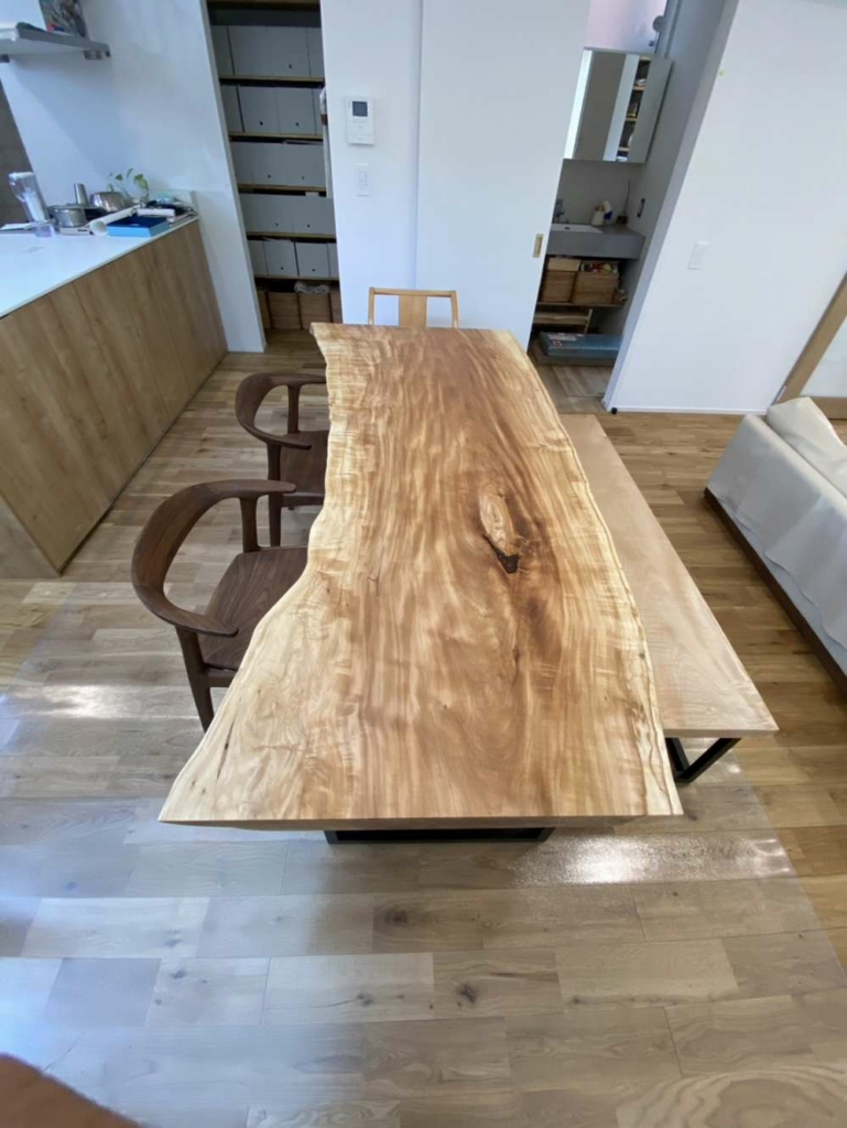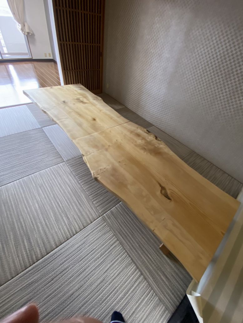 カットする予定の栃一枚板ですが今回は取り敢えず、椅子や棚が入って生活してから何cmカットするか考えましょうとお伝えさせて貰うと大変喜んで頂きました♪