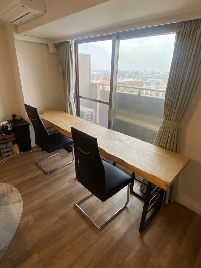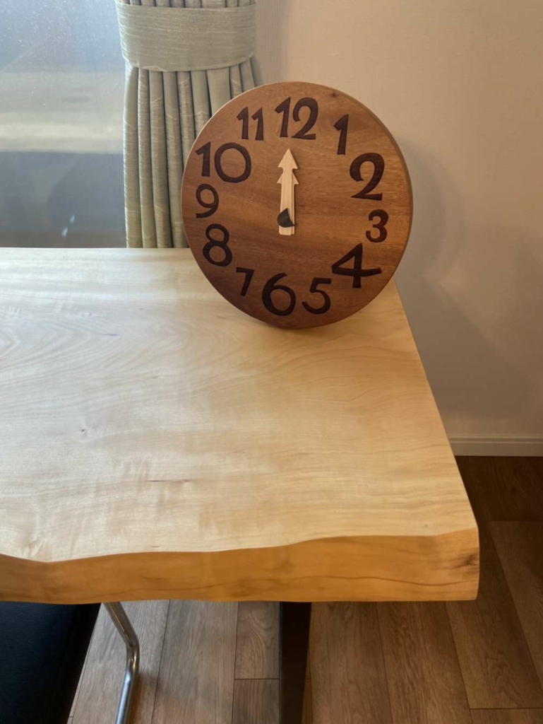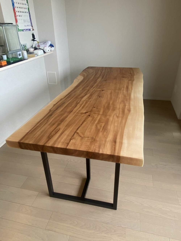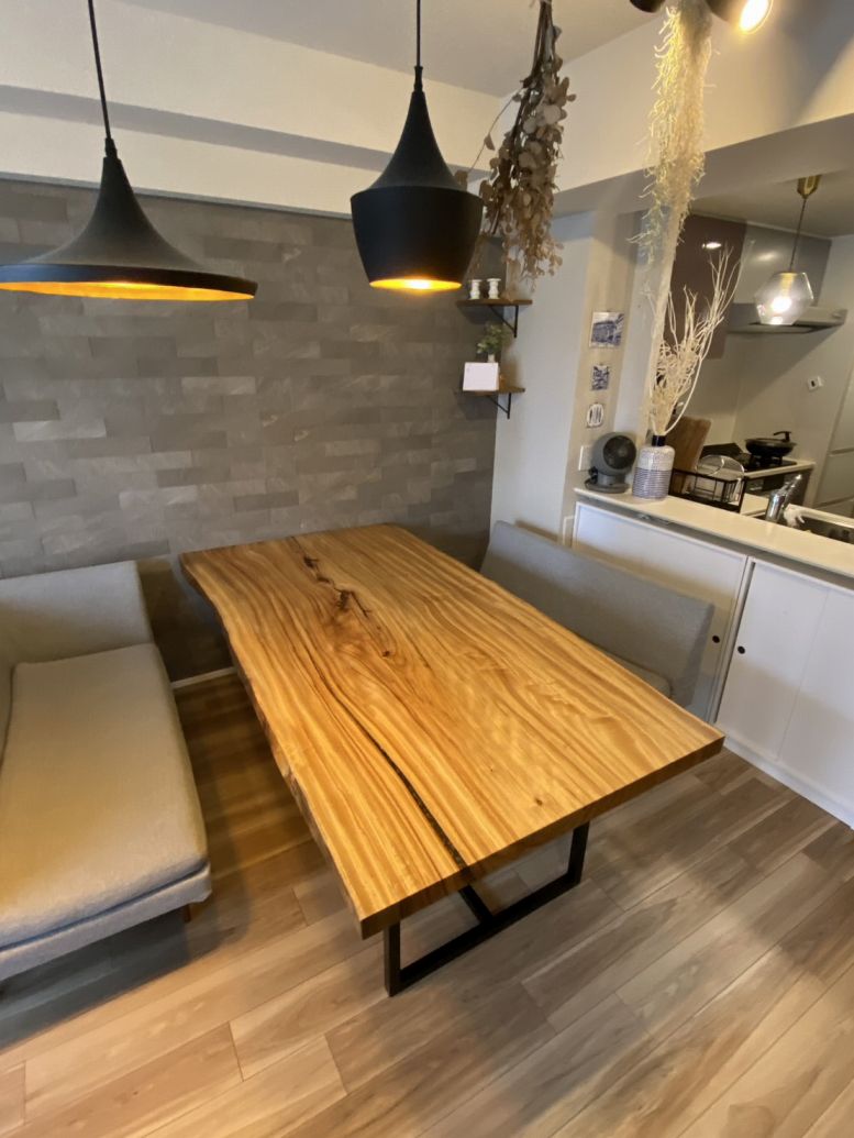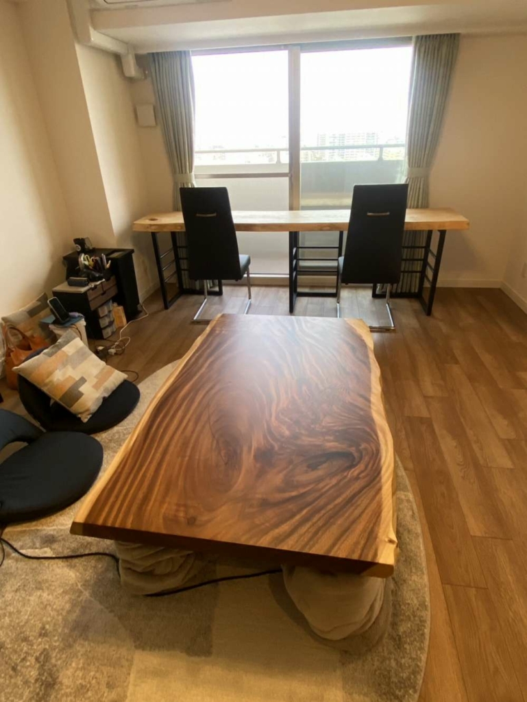カットする予定の栃一枚板ですが今回は取り敢えず、椅子や棚が入って生活してから何cmカットするか考えましょうとお伝えさせて貰うと大変喜んで頂きました♪