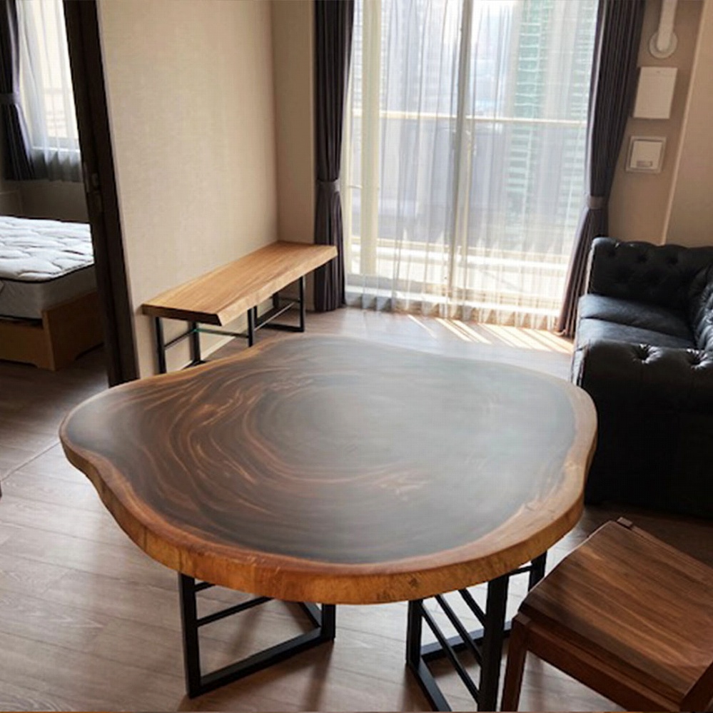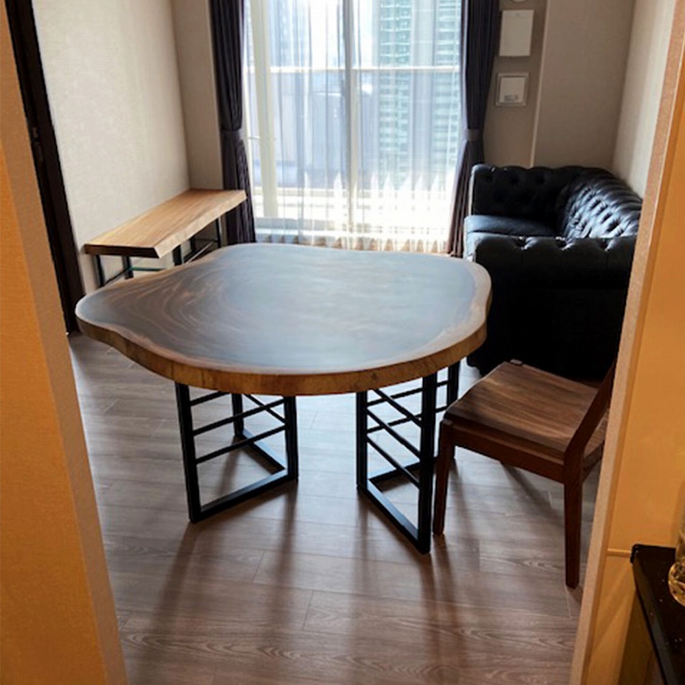 大きなモンキーポッドの輪切りタイプの一枚板です。この太さの木をテーブルにするなんて本当に贅沢です。L型のスリムな脚を対でセッティングしてお洒落な空間の完成です。まるで落ち着くカフェのようなお部屋に仕上がりました。