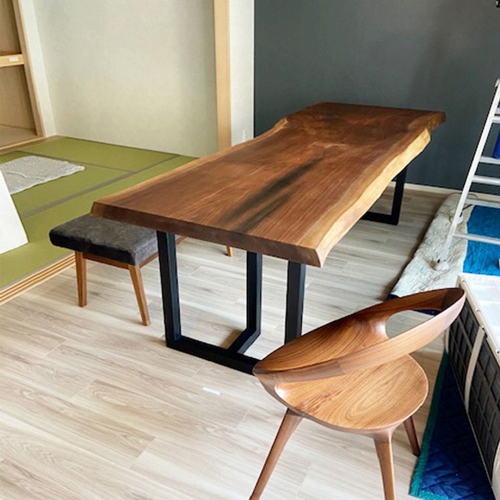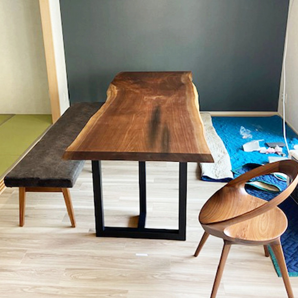 ゆったりと大きなサイズ感が貫禄のあるウォールナット材の一枚位板をお届けさせていただきました。明るいフローリング材によく映える一枚です。黒いアイアン角脚のバランスも良く、重くなりすぎない適度な重厚感ですっきりとして見えます。