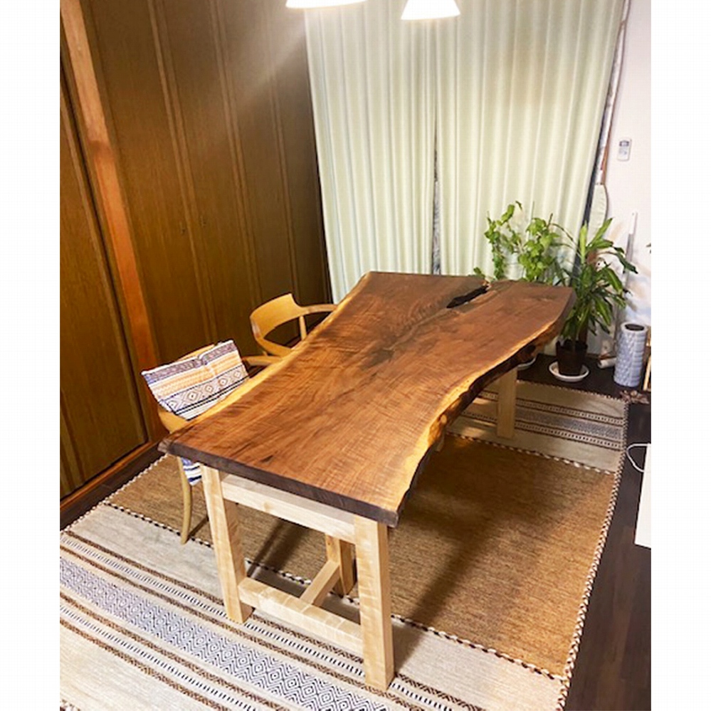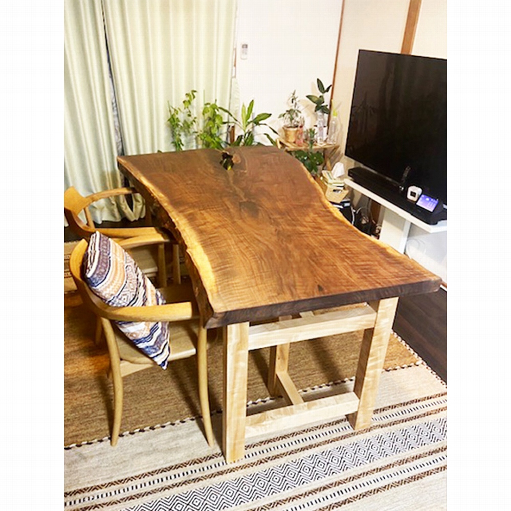 柔らかな雰囲気のお部屋にぴったりな、ウォールナットの一枚板と栃(トチ)材の脚の組み合わせのダイニングをお届けさせていただきました。かっこいいウォールナットの一枚板ですが、脚を栃にしたことで優しい雰囲気も感じますね。