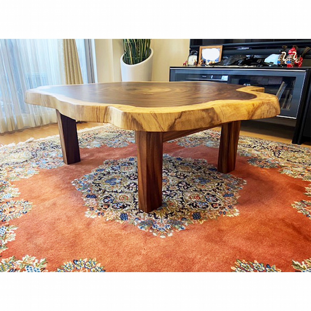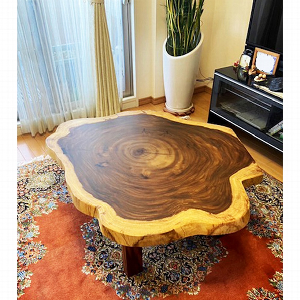ユニークな形のモンキーポッドの輪切りの一枚板をお届けさせていただきました。大きく立派なサイズの木です。それを輪切りにしたものです。なかなかない輪切り、そしてこの大きさなので貴重な一枚です。お部屋に馴染んでいてとても心地良さそうです。