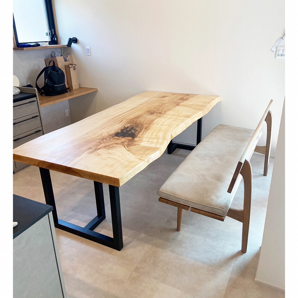 明るい太陽の光が入るダイニングスペースに、栃の一枚板をお届けさせていただきました。