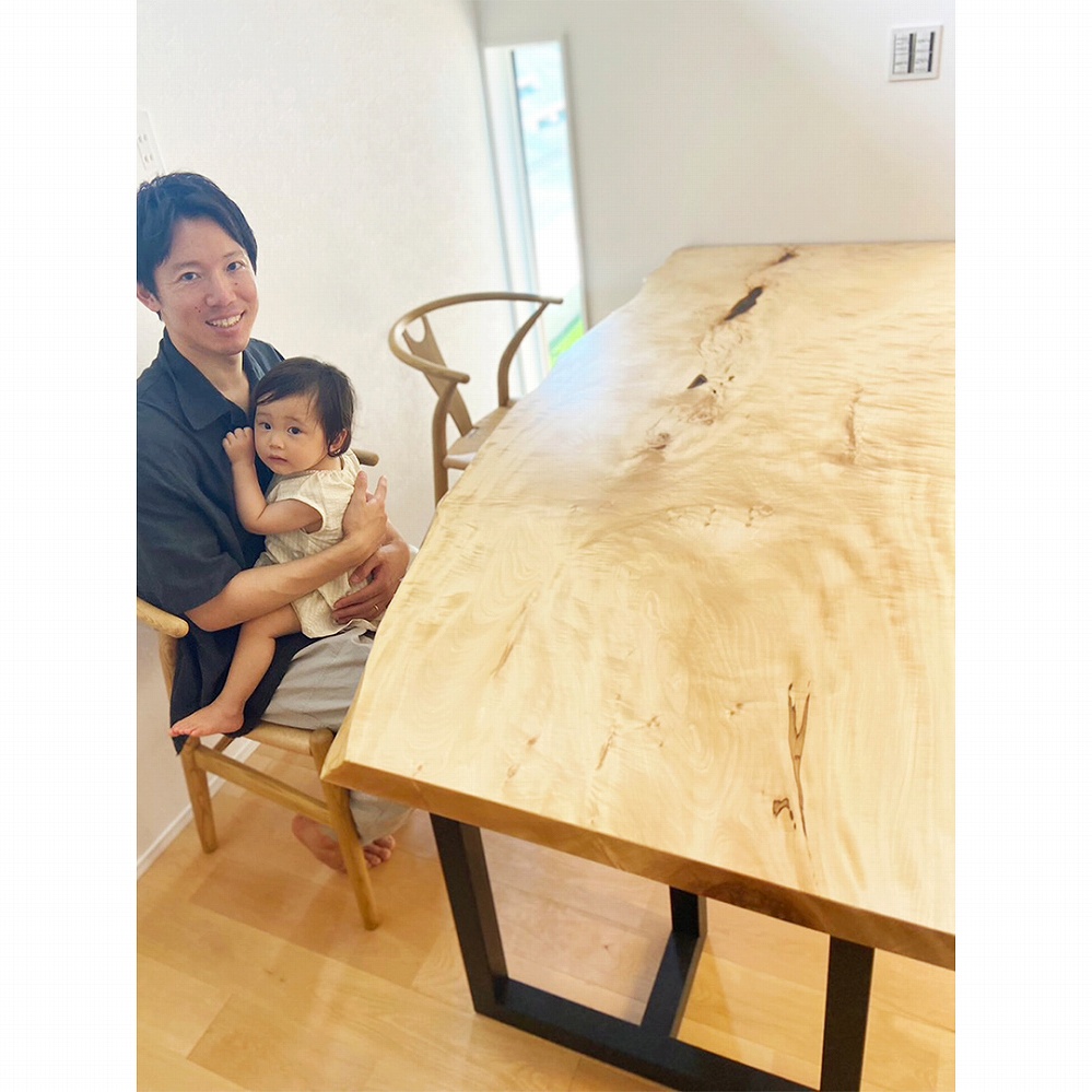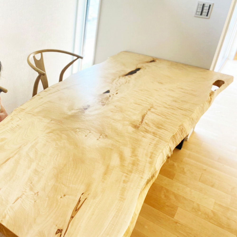 美しい杢が散りばめられた栃の一枚板をお届けさせていただきました。明るいお部屋が更に明るい空間になりました。自然のままに仕上げたユニークな形はまさに唯一無二の一枚です。