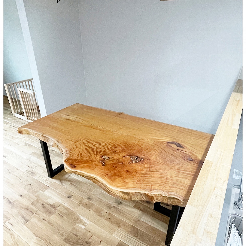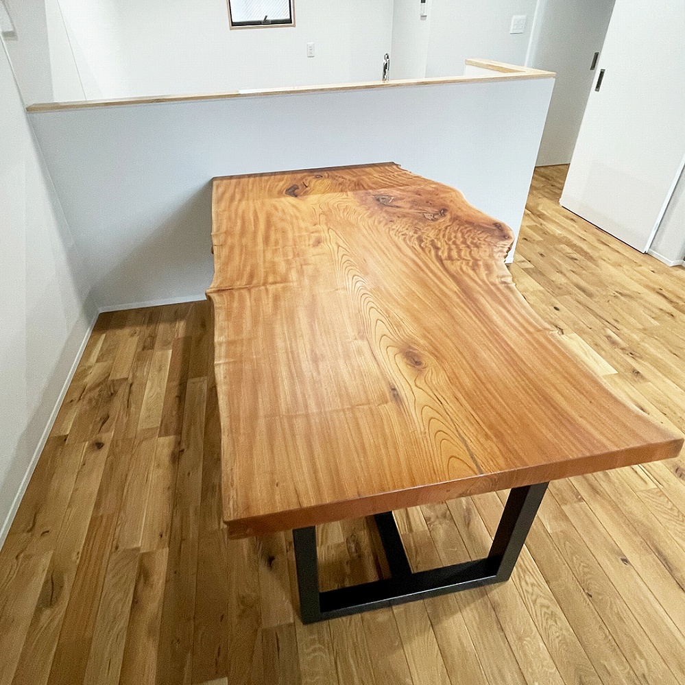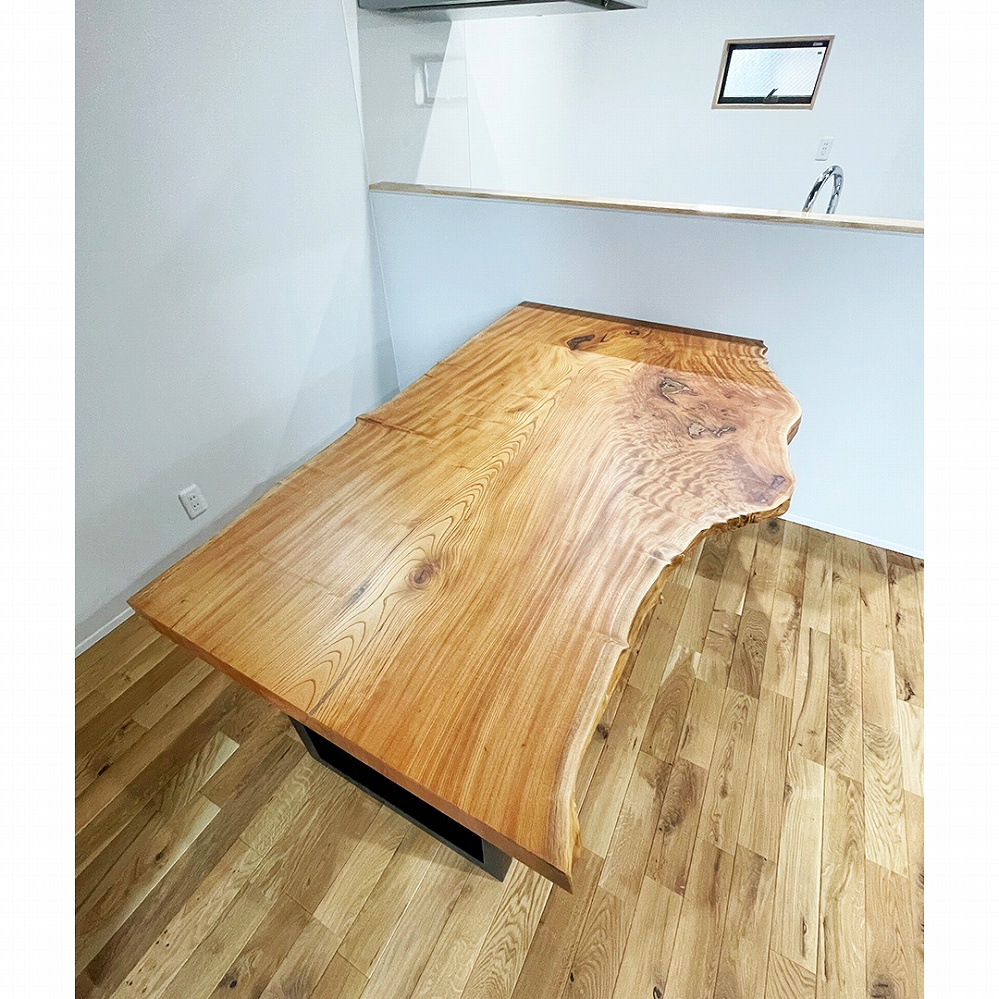 美しい羽根を広げたような杢が素敵な欅(ケヤキ)の一枚板をお届けさせていただきました。お届けを楽しみにお待ち頂いて嬉しい限りです。無数に走るヒダが繊細で美しい一枚です。瘤の部分の歪みのある杢が良い表情を出していますね。