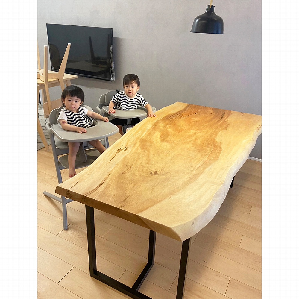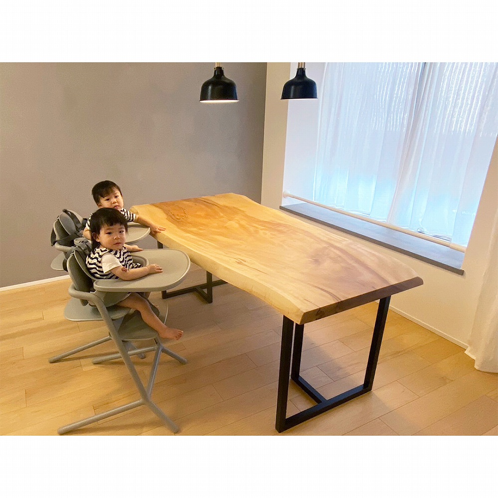 お洒落な照明の下に主役として栃(トチ)の一枚板をお届けさせていただきました。スリムなアイアンの角脚もバランスが良いです。お子様達の表情からも一枚板には癒しの効果があるというのが分かりますね。