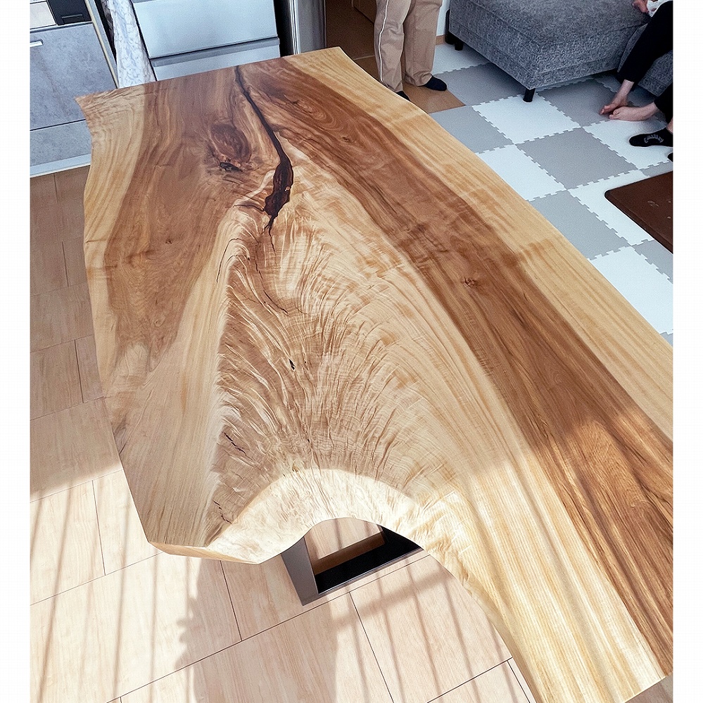 美しい杢が映える栃(トチ)の一枚板をお届けさせていただきました。端っこを一口かじられたアイスのような愛嬌のある一枚です。そこから表れている杢がなんとも美しいです!見るたびに引き込まれてしまう一枚です。