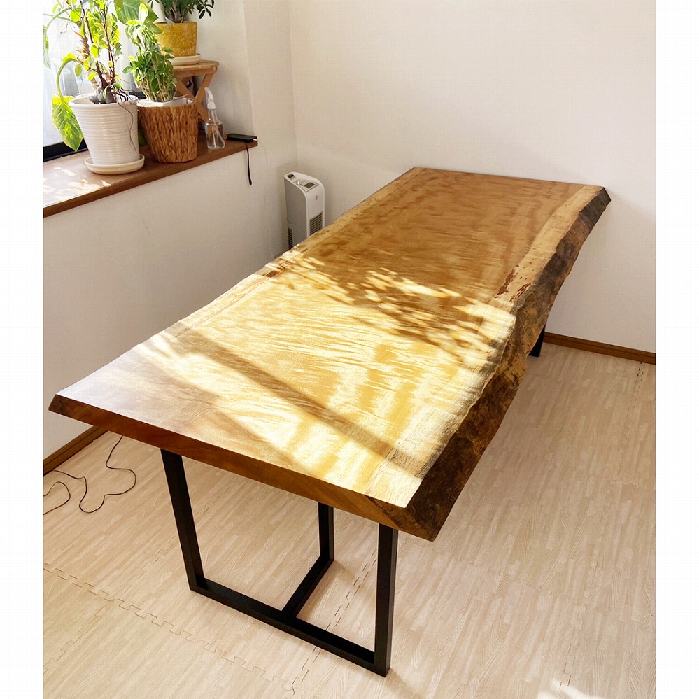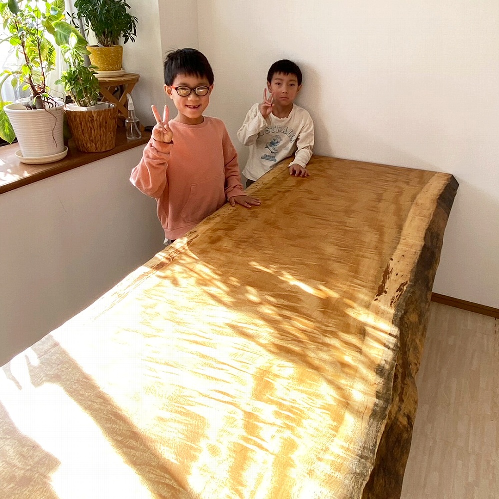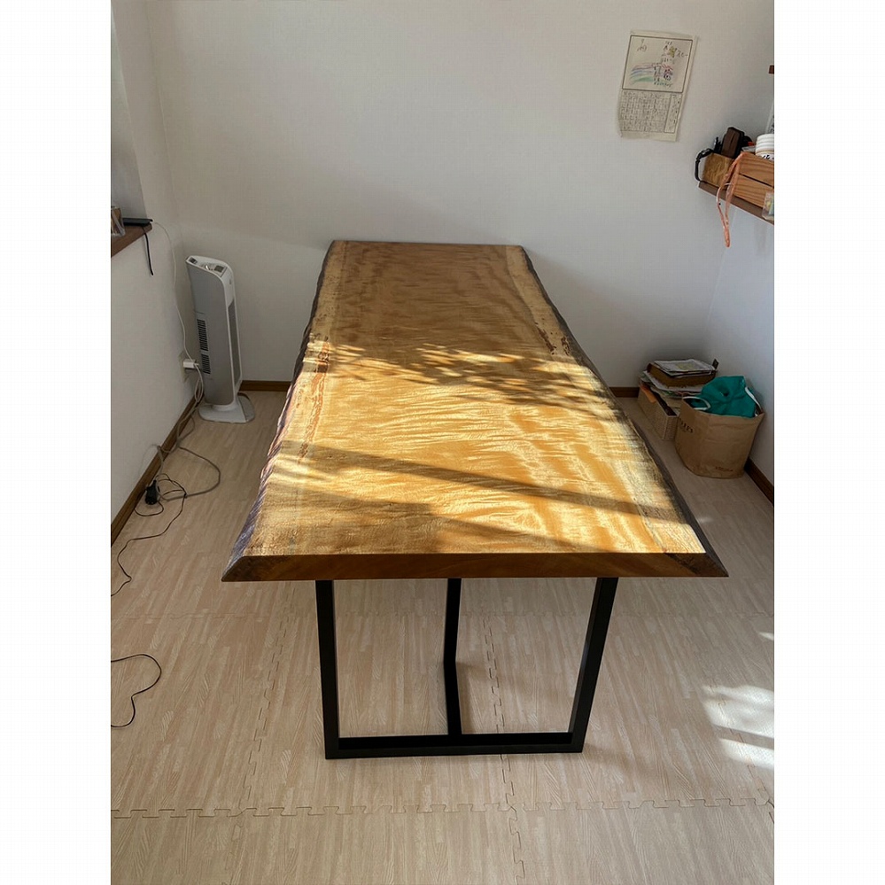 とても美しい杢が溢れるモビンギの一枚板をお届けさせていただきました。明るい色合いは見ていると元気が出ます。太陽の光を浴びてより華やかな雰囲気になります。