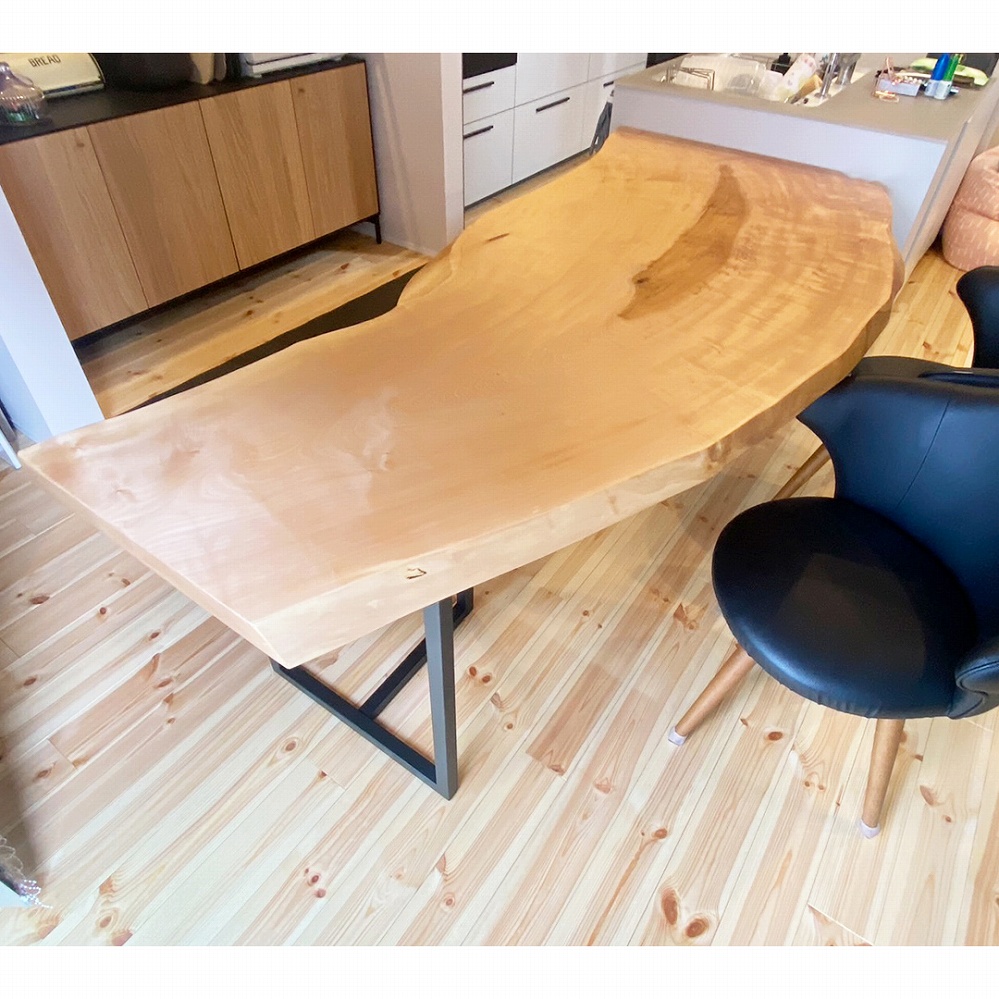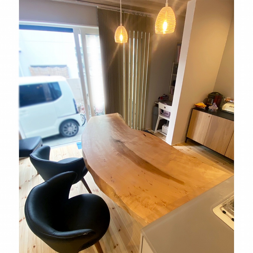 緩やかにカーブした美しい栃(トチ)の一枚板をお届けさせていただきました。赤みの少ない栃は明るい雰囲気のお部屋にぴったりです。湾曲した形がお部屋に流れを取り入れて気持ちのいい空間になりました。