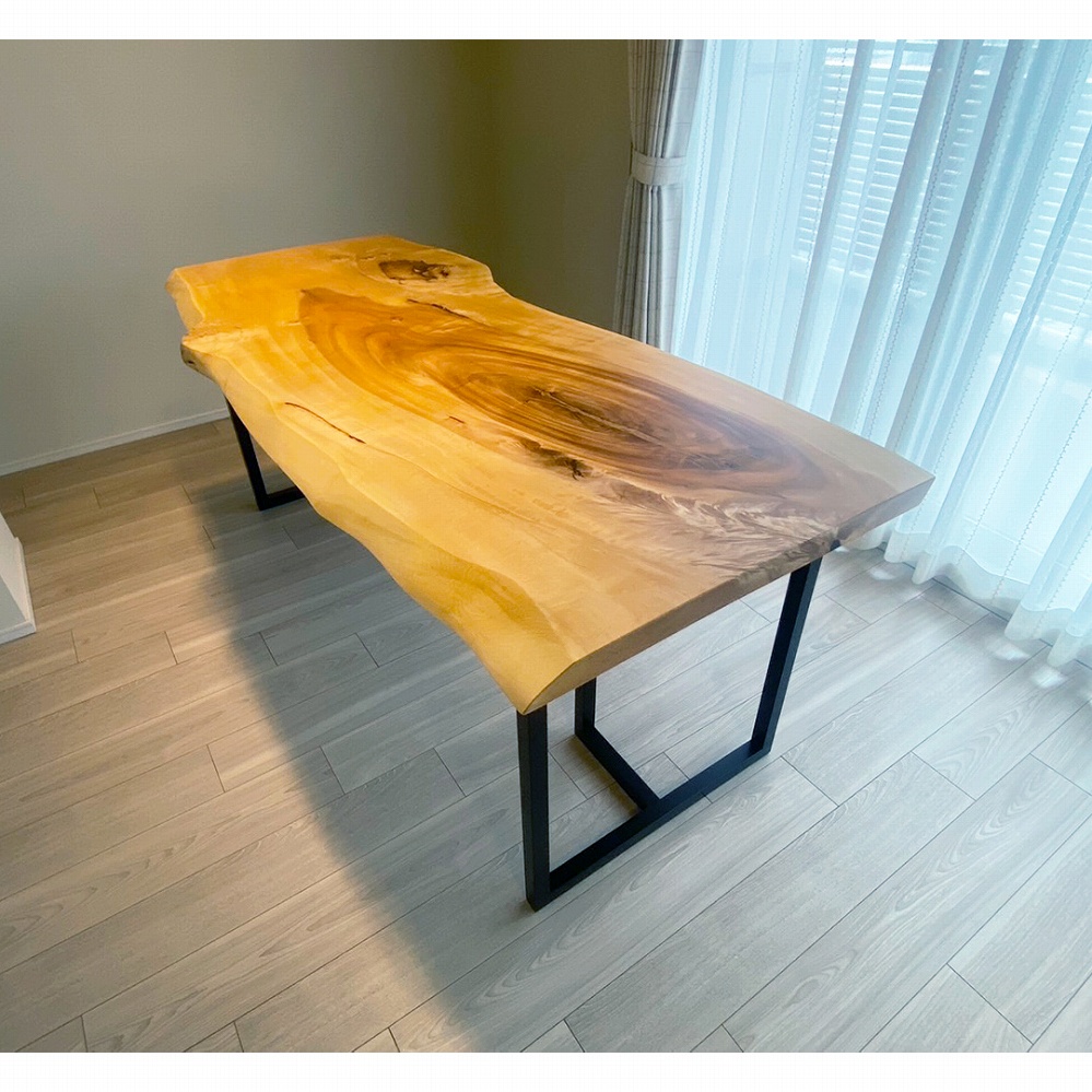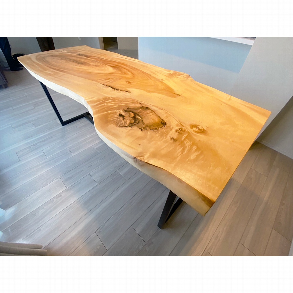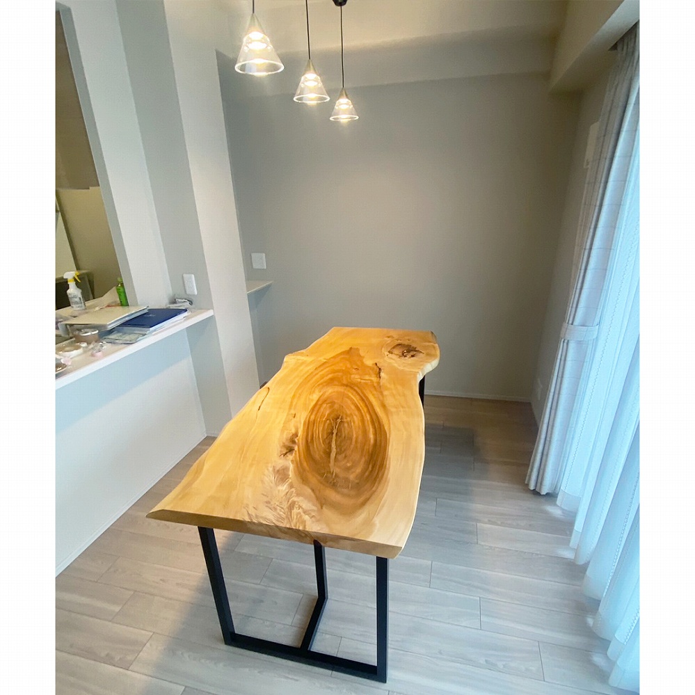 明るいご新居のダイニングに栃(トチ)の一枚板をお届けさせていただきました。渦巻くような木目とその周りに表れた杢に目を奪われてしまします。細身ながらもボリュームを感じる栃の一枚板ですね。
