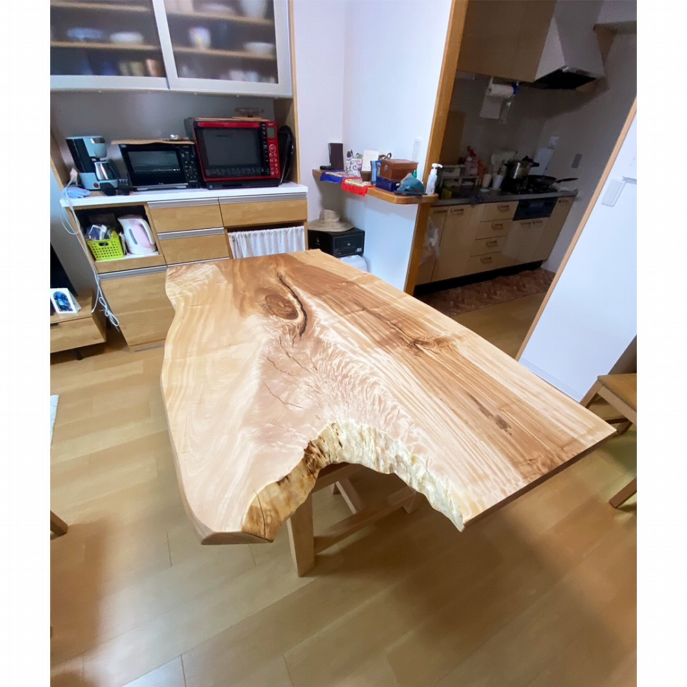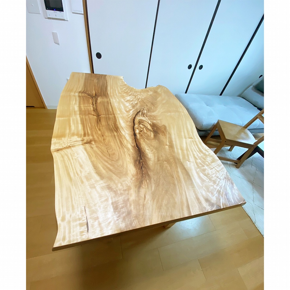 明るく煌びやかな栃(トチ)の一枚板をお届けさせていただきました。
