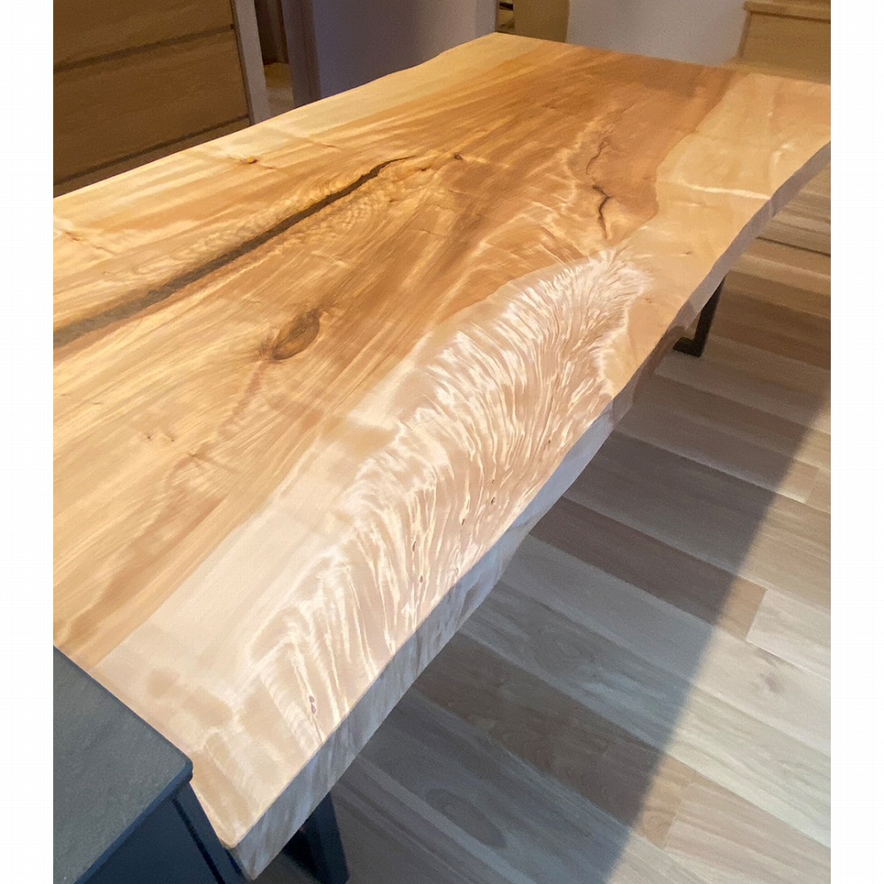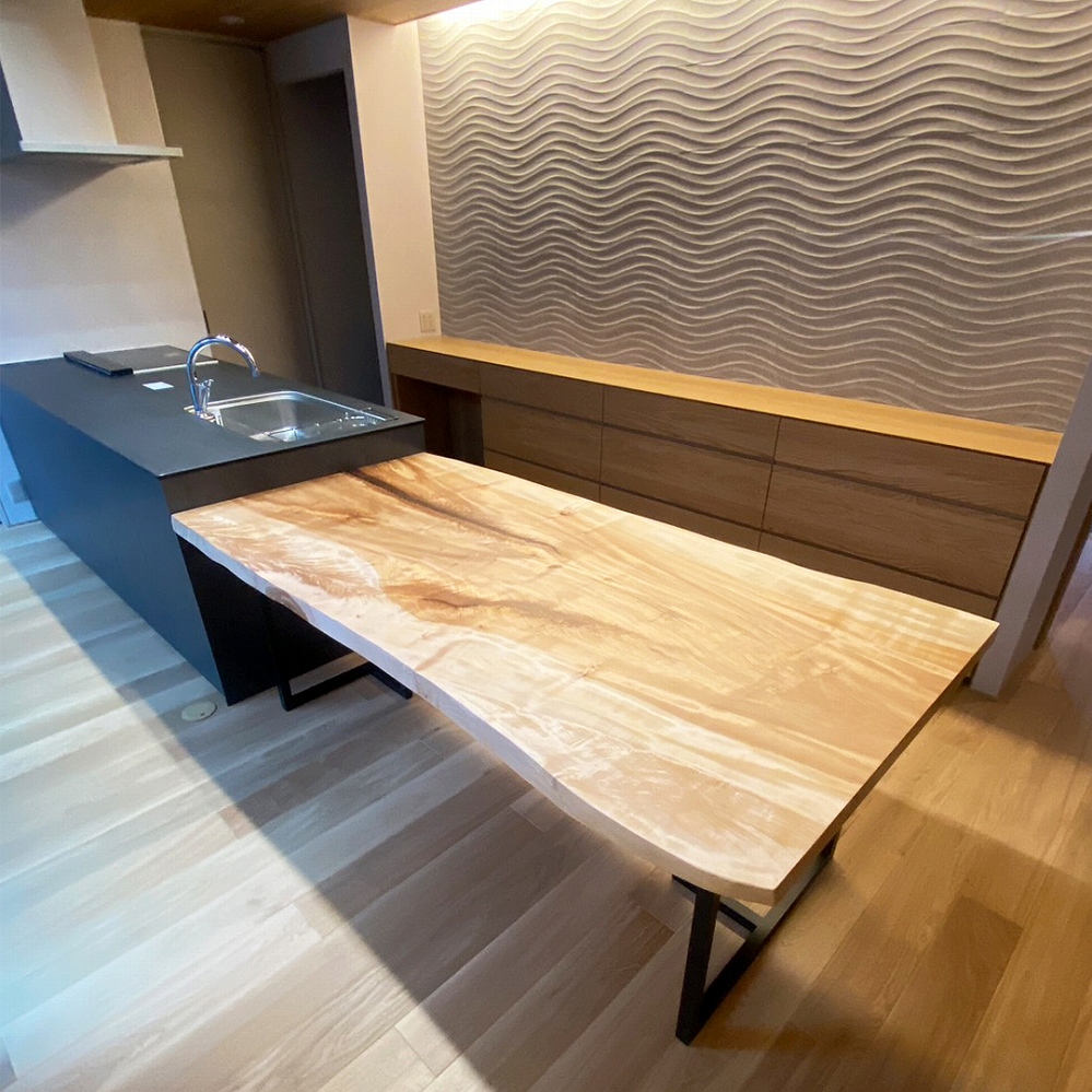 素晴らしい杢が輝く栃(トチ)の一枚板をお届けさせていただきました。サイズ感も雰囲気もこちらのお家にピッタリです。栃の白さでパッと華やかなリビングになりましたね。