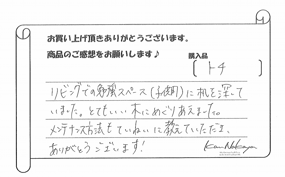 とてもかわいいデスクになりました。栃の白く明るい色がとても素敵です。