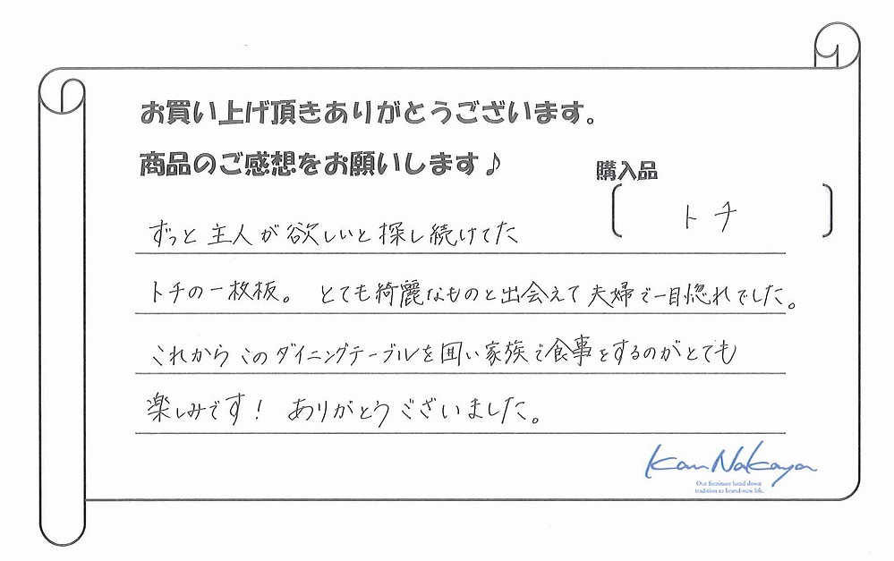 『ずっと主人が欲しいと探し続けてたトチの一枚板。とても綺麗なものと出会えて夫婦で一目惚れでした。