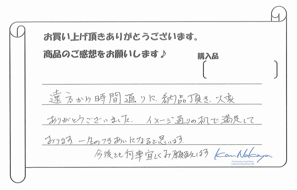『遠方から時間通りに納品頂き、大変ありがとうございました。イメージ通りの机で満足しております。一生のつきあいになると思います。