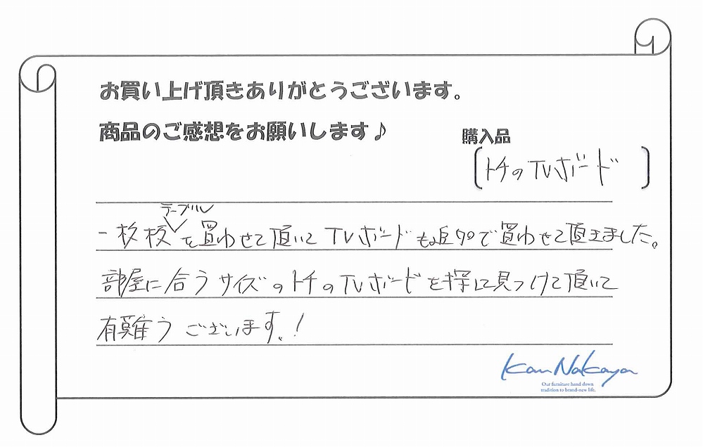 『一枚板テーブルを買わせて頂いてTVボードも追加で買わせて頂きました。