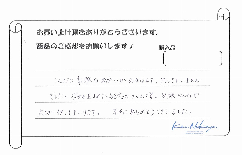 次女の生まれた記念のつくえです。家族みんなで大切に使ってまいります。本当にありがとうございました。』