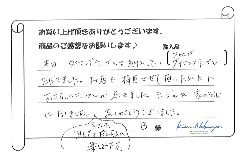 『本日、ダイニングテーブルを納入していただきました。
