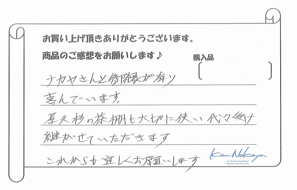 屋久杉の茶棚も大切に使い、代々受け継がせていただきます。