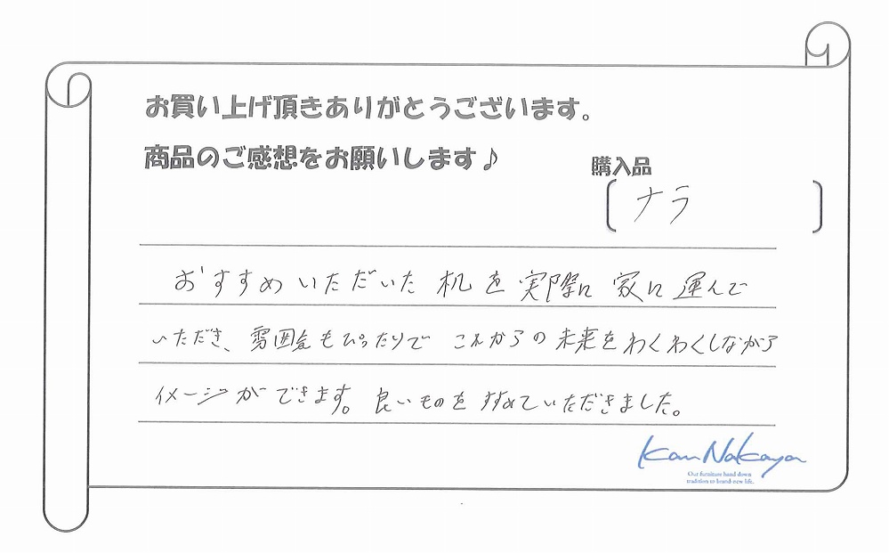 『おすすめいただいた机を実際に家に運んでいただき、雰囲気もぴったりでこれからの未来をわくわくしながらイメージができます。良いものをすすめていただきました。』
