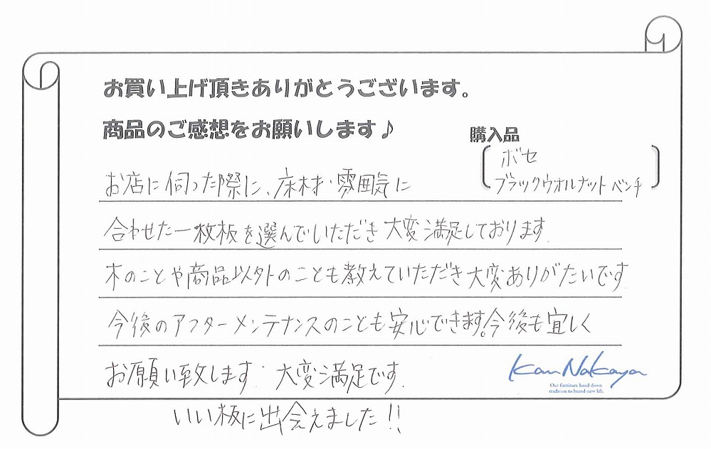 『お店に伺った際に、床材・雰囲気に合わせた一枚板を選んでいただき大変満足しております。木のことや商品以外のことも教えていただき大変ありがたいです。今後のアフターメンテナンスのことも安心できます。