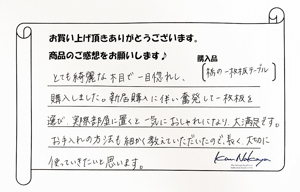 『とても綺麗な木目で一目惚れし、購入しました。新居購入に伴い奮発して一枚板を選び、実際部屋に置くと一気におしゃれになり、大満足です。お手入れの方法も細かく教えていただいたので、長く、大切に
