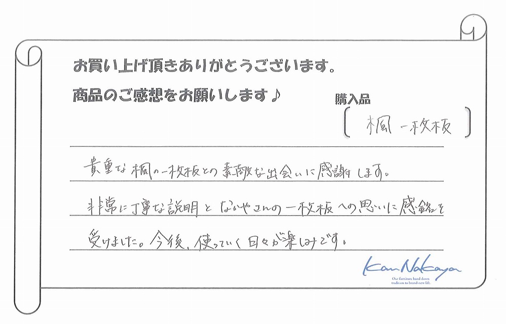 非常に丁寧な説明となかやさんの一枚板への思いに感銘を受けました。今後、使っていく日々が楽しみです。』