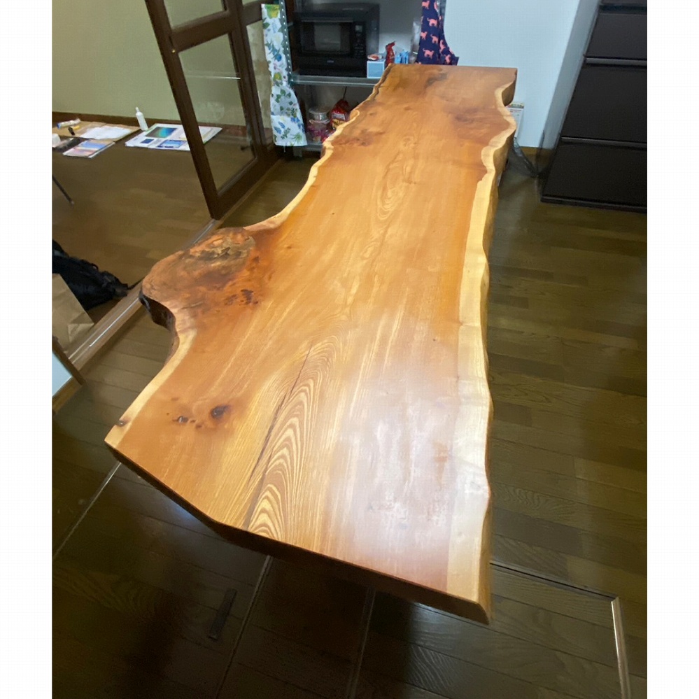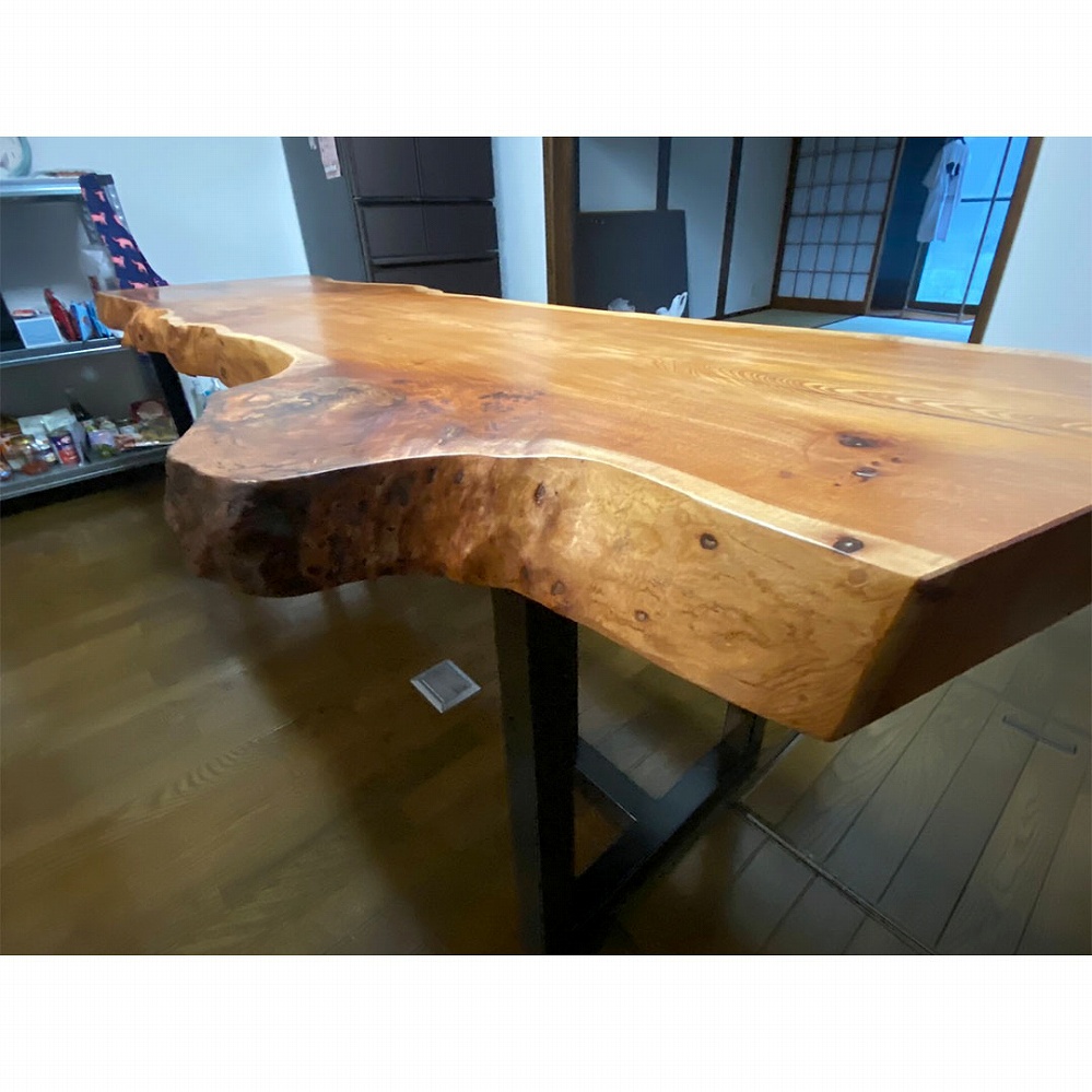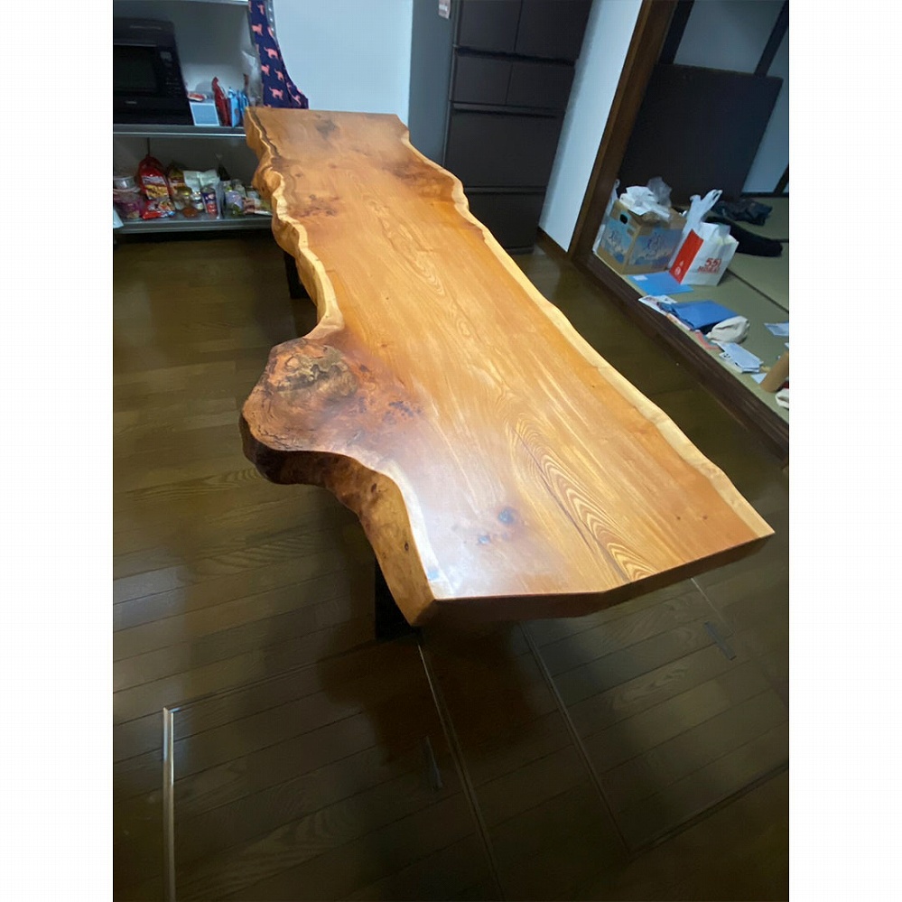 コブの入ったユニークな形をした欅(ケヤキ)の一枚板をお届けさせていただきました。自然のままに活かしたその風合いはとても面白みのある一枚です。細長いラインでも厚みは5㎝を軽く超え、美しい杢が放つ華やかさは見応え十分です。