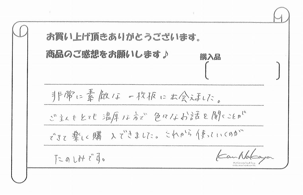 ご主人もとても温厚な方で、色々なお話を聞くことができて楽しく購入できました。これから使っていくのがたのしみです。』