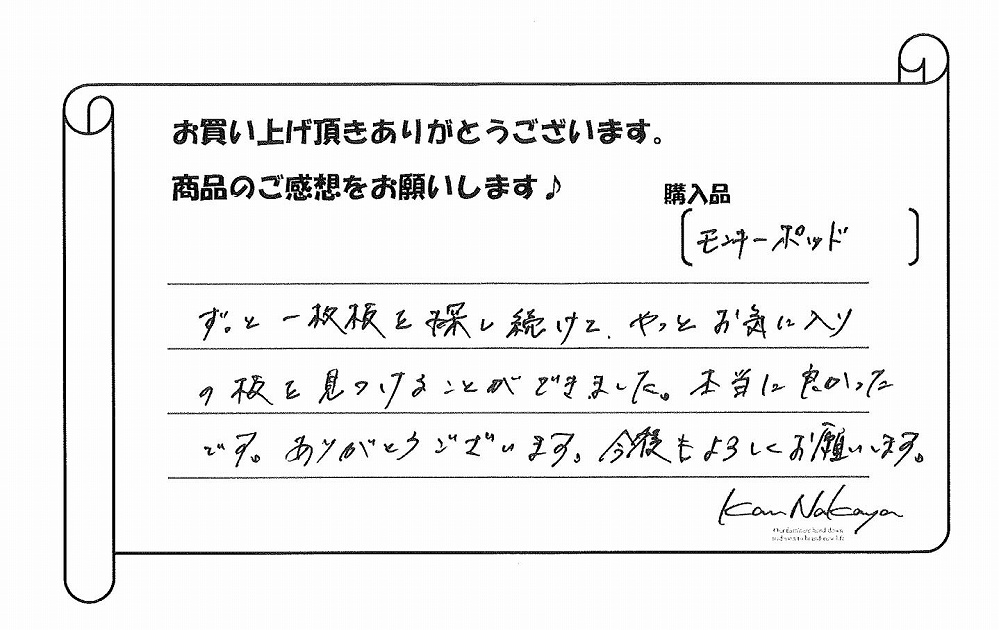 『ずっと一枚板を探し続けて、やっとお気に入りの板を見つける事が出来ました。本当によかったです。ありがとうございます。