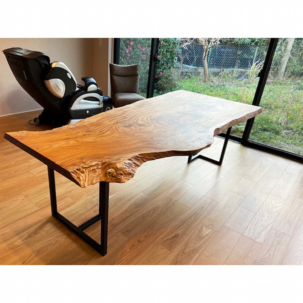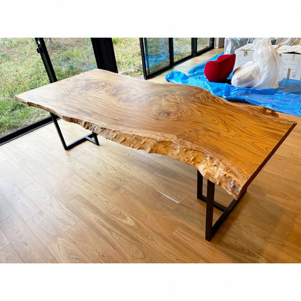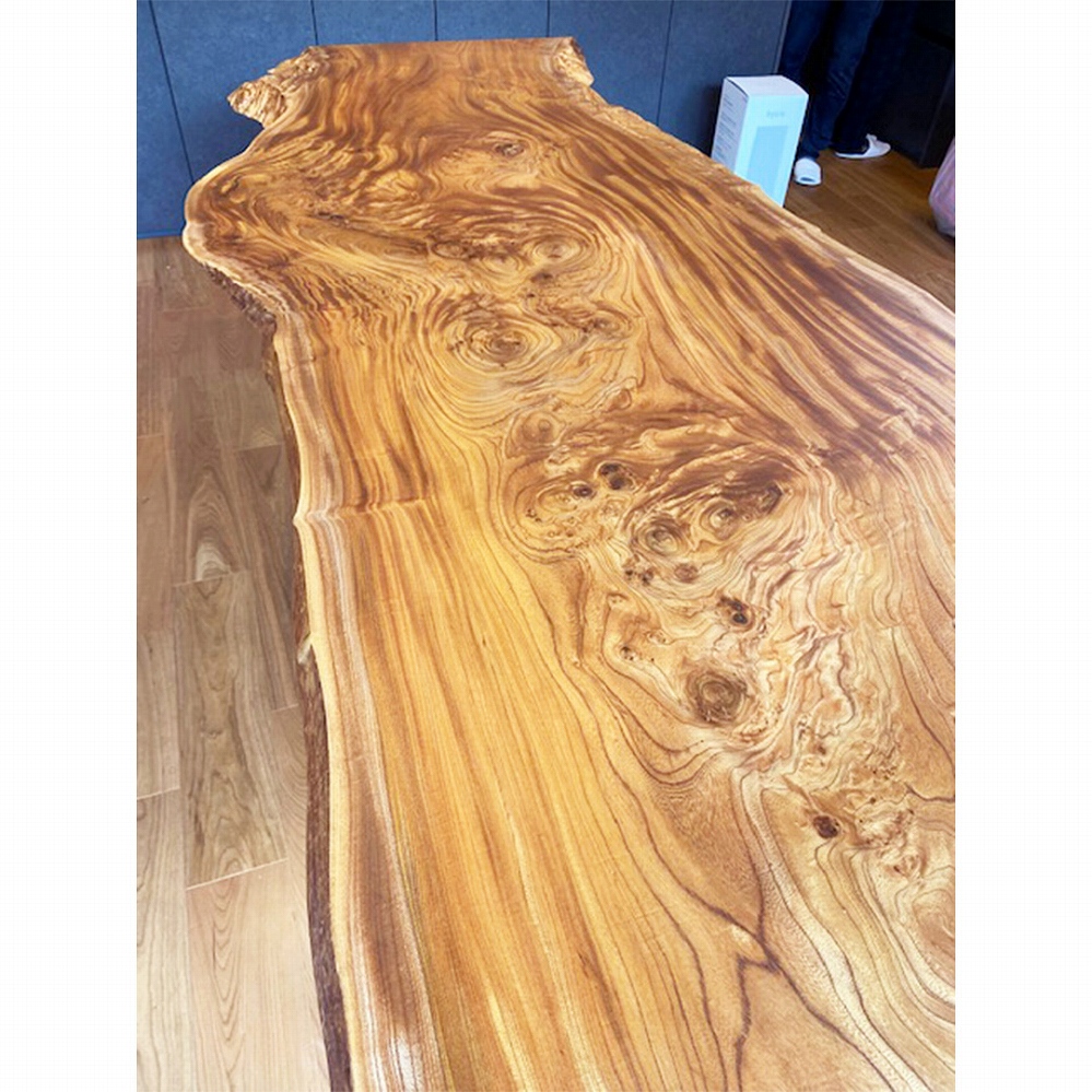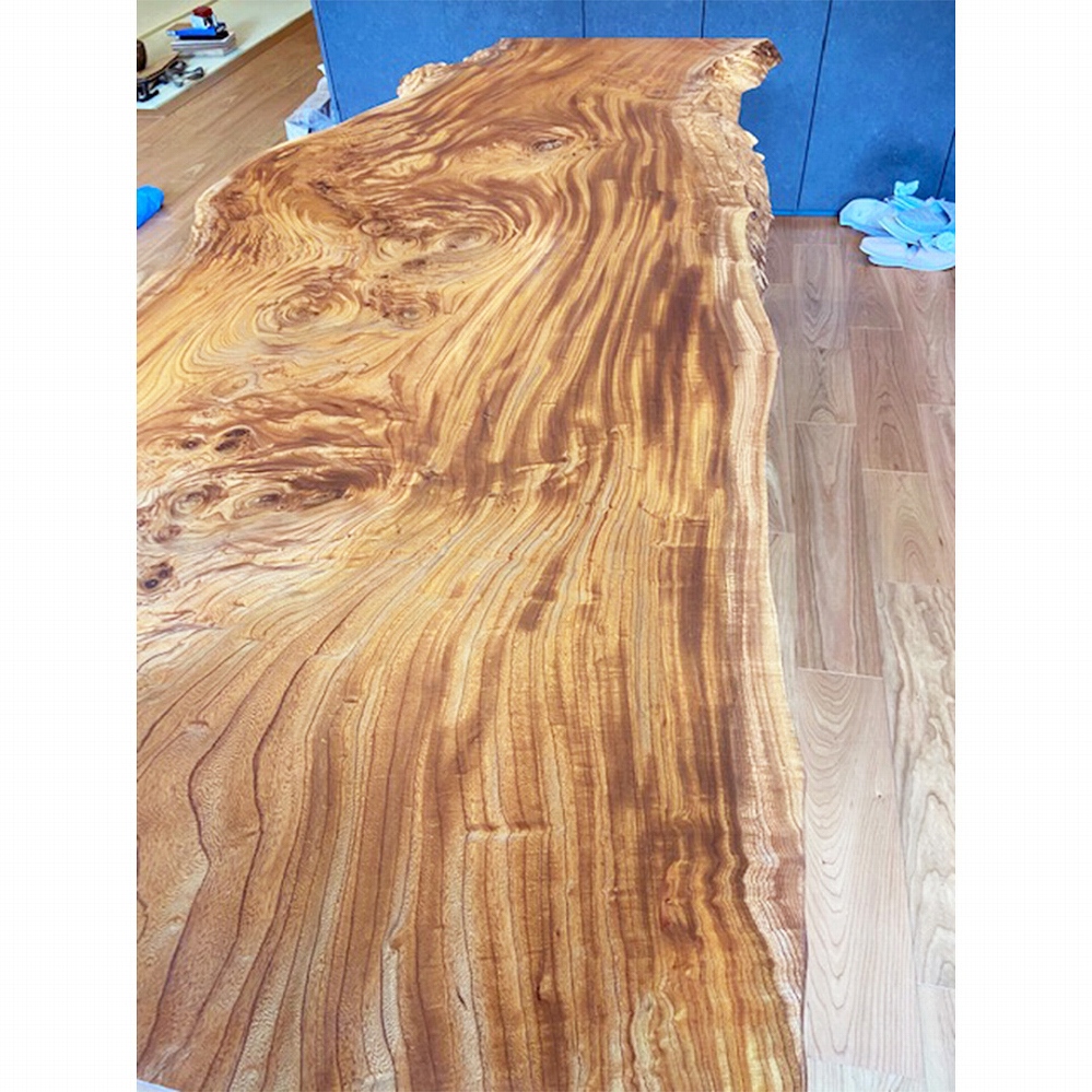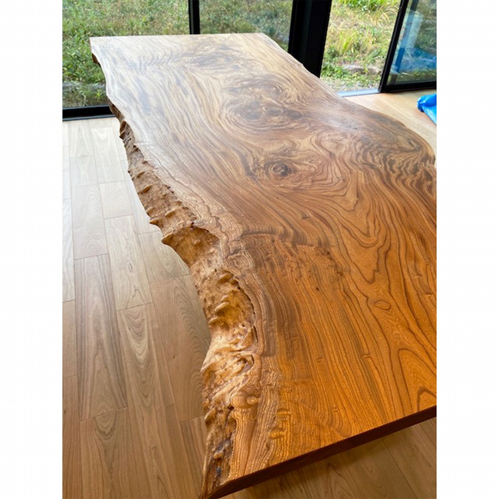 圧巻の杢が素敵な欅(ケヤキ)の一枚板をお届けさせていただきました。このケヤキの天板はまさに芸術品です。即決されたのも納得の一枚です。なんとも言えない素晴らしい杢目からは目を離せませんね。ミミのコブや樹皮も自然のままで、何とも贅沢な一枚です。