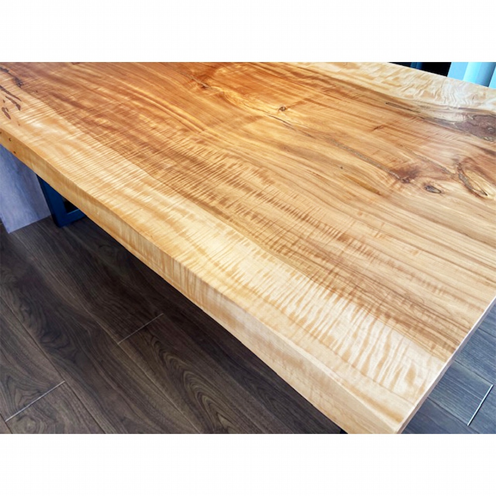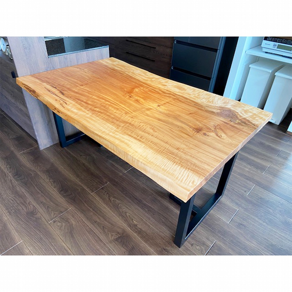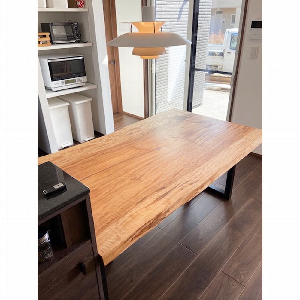 美しい縮み杢が沢山入った素敵な栃(トチ)の一枚板をお届けしました。全体的に綺麗な杢が散りばめられた素敵な天板です。落ち着いたトーンのフローリングにアクセントとなる栃(トチ)がとても映えます。