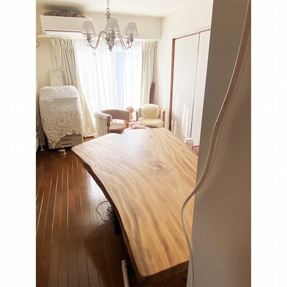 日の光が注ぎ込む明るいお部屋に大きな楠(クス)の一枚板をお届けさせていただきました。落ち着いた色合いのフローリングにぴったりの雰囲気です。大きく大胆な木目の楠(クス)で柔らかな表情が特徴です。どこへ座っても美しい楠(クス)の木目に癒されます。