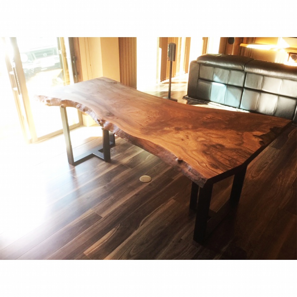 クラロウォールナットの一枚板をお届けさせて頂きました。クラロウォールナットならではの深い色合いと変形がなんともかっこいい一枚です。アイアンの脚を合わせる事でより引き締まって見えます。