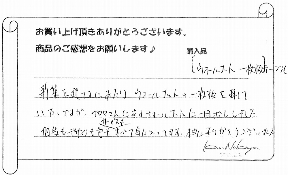 『新築を建てるにあたり、ウォールナットの一枚板を探していたのですが、ナカヤさんに来てウォールナットに一目ぼれしました。値段もデザインも色もサービスもすべて気に入っています。