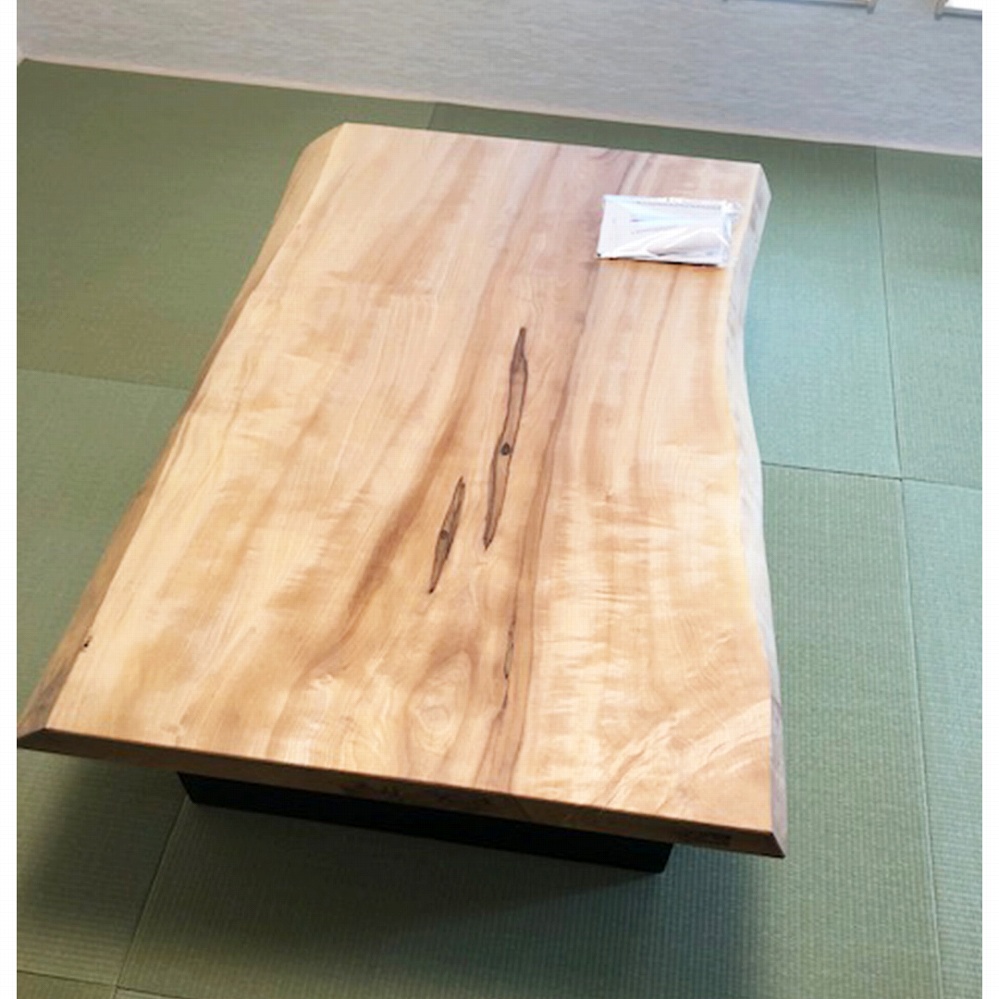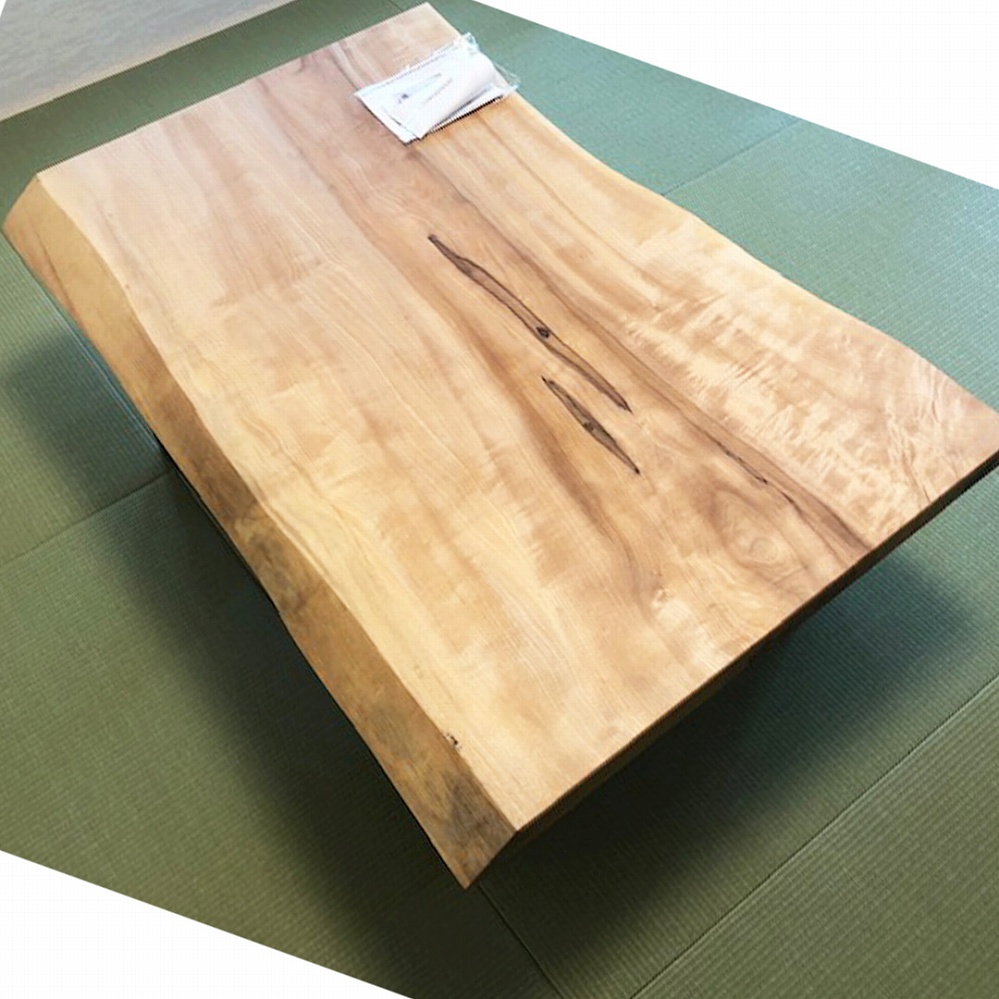 小ぶりな栃(トチ)の一枚板をお届けさせていただきました。グリーンが良く合う栃(トチ)です。琉球畳の上に置かれた栃(トチ)も楽しそうです。入り皮の入ったチャーミングな一枚です。明るい色合いの栃なので、お部屋がぱーっと華やかな印象になります。