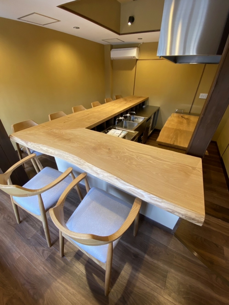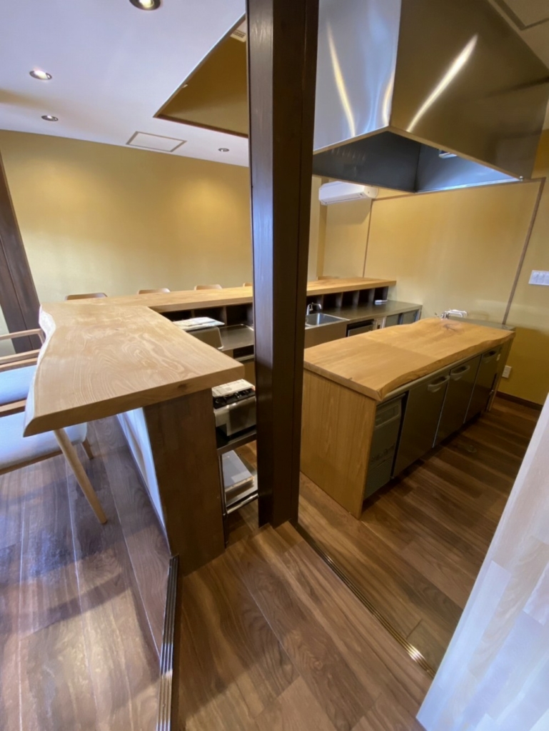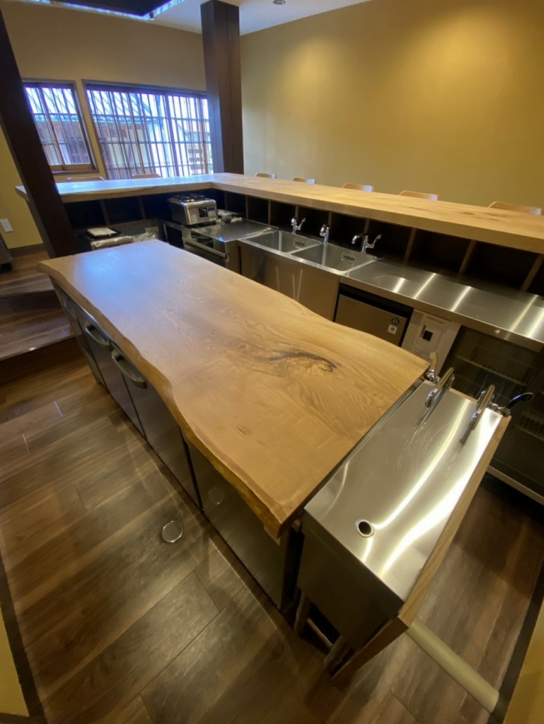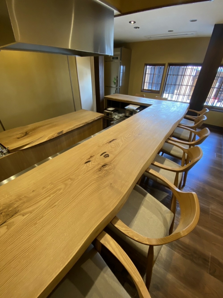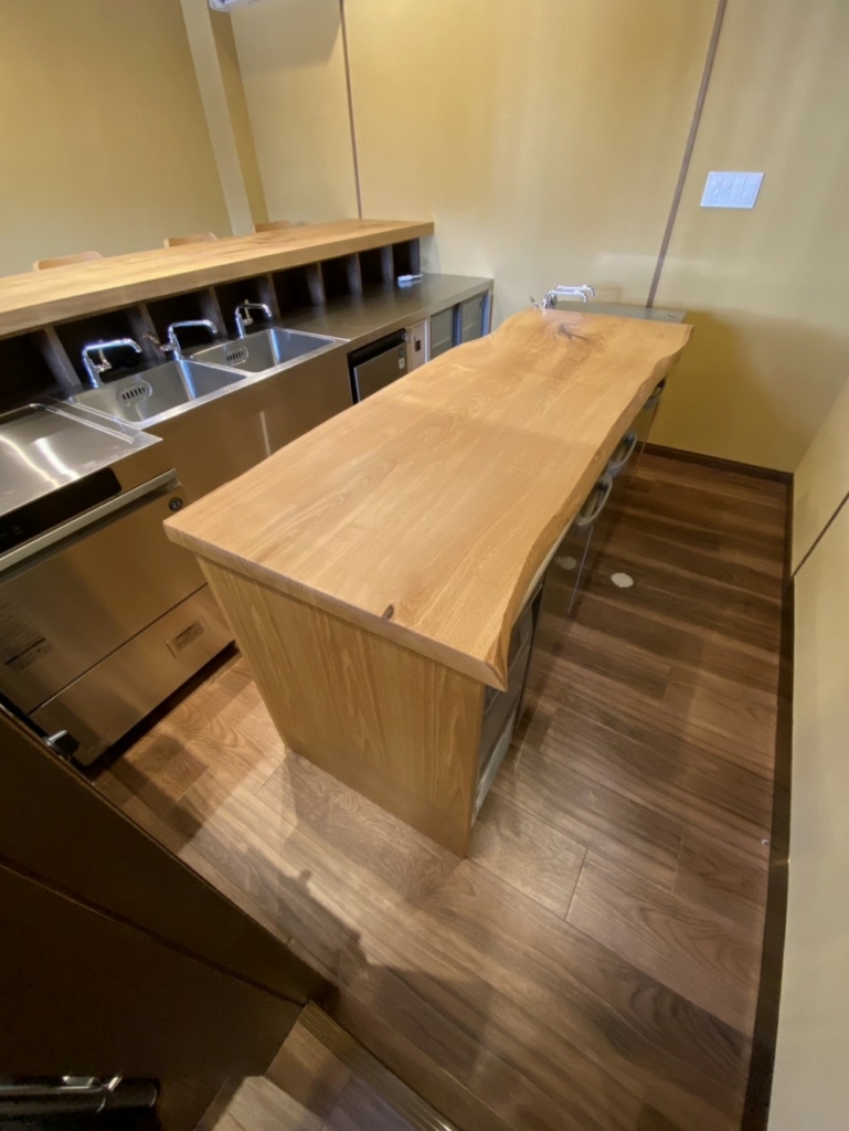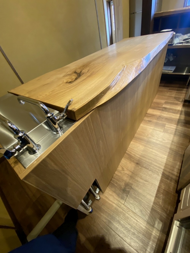 そちらに栗の一枚板カウンターと、厨房の中の台下冷蔵庫を隠す為のカバーをオーク材で天板を栗の一枚板で製作させて頂きました^ ^