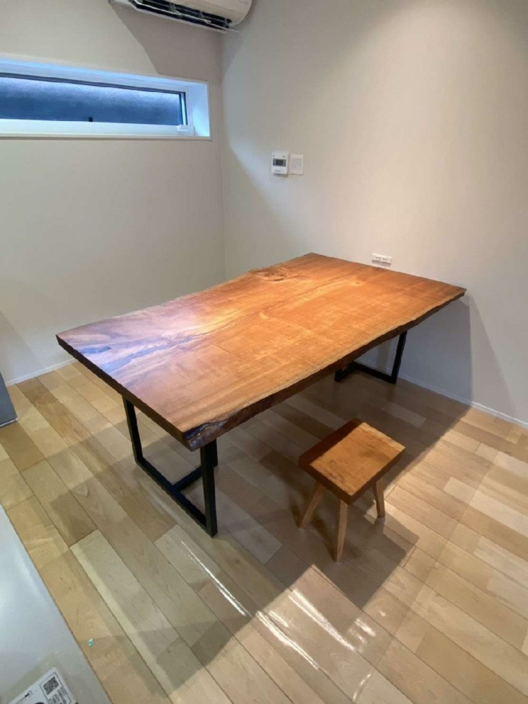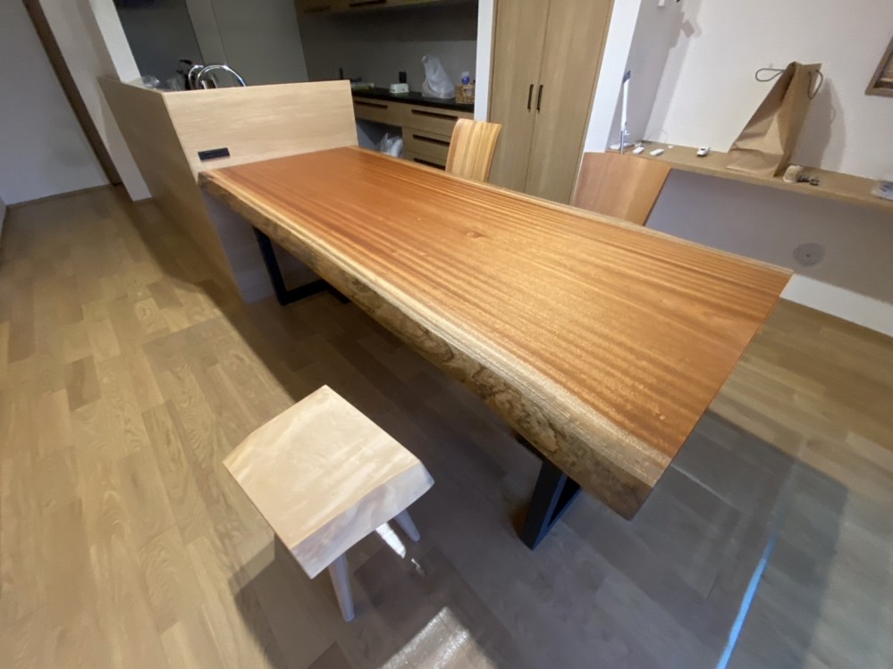 枚方のお客様宅へサペリの一枚板とオーク材のダイニングチェアー、一枚板スツールをお届けしました^ ^