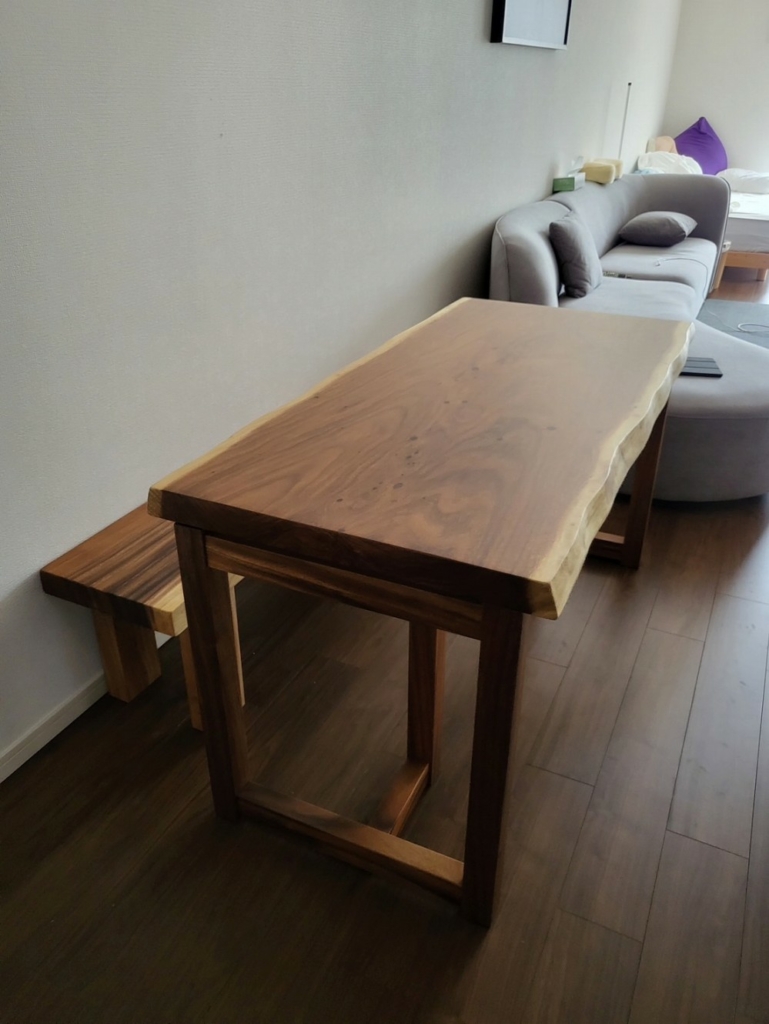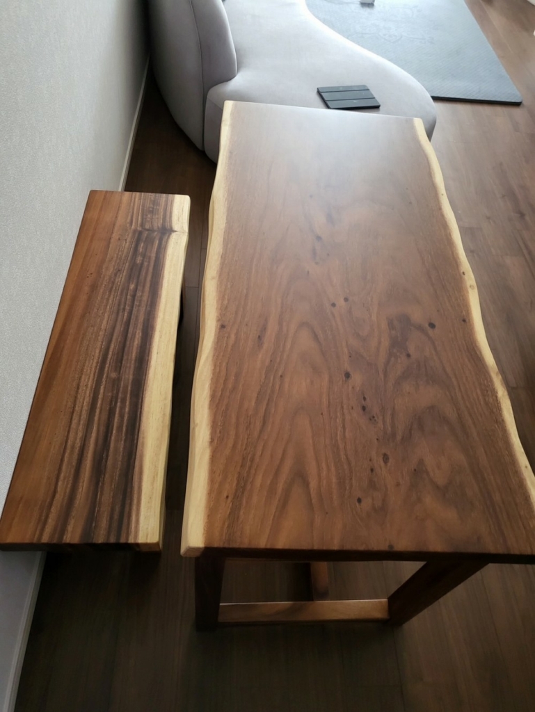 テーブル用一枚板をモンキーポットでお決め頂き、脚とベンチもモンキーポットで別注でお作りさせて頂きました。