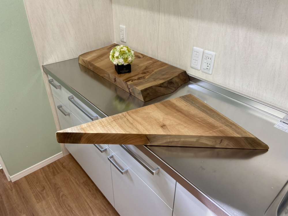 1800にカットした欅一枚板、2400×1200の大きな楠一枚板、