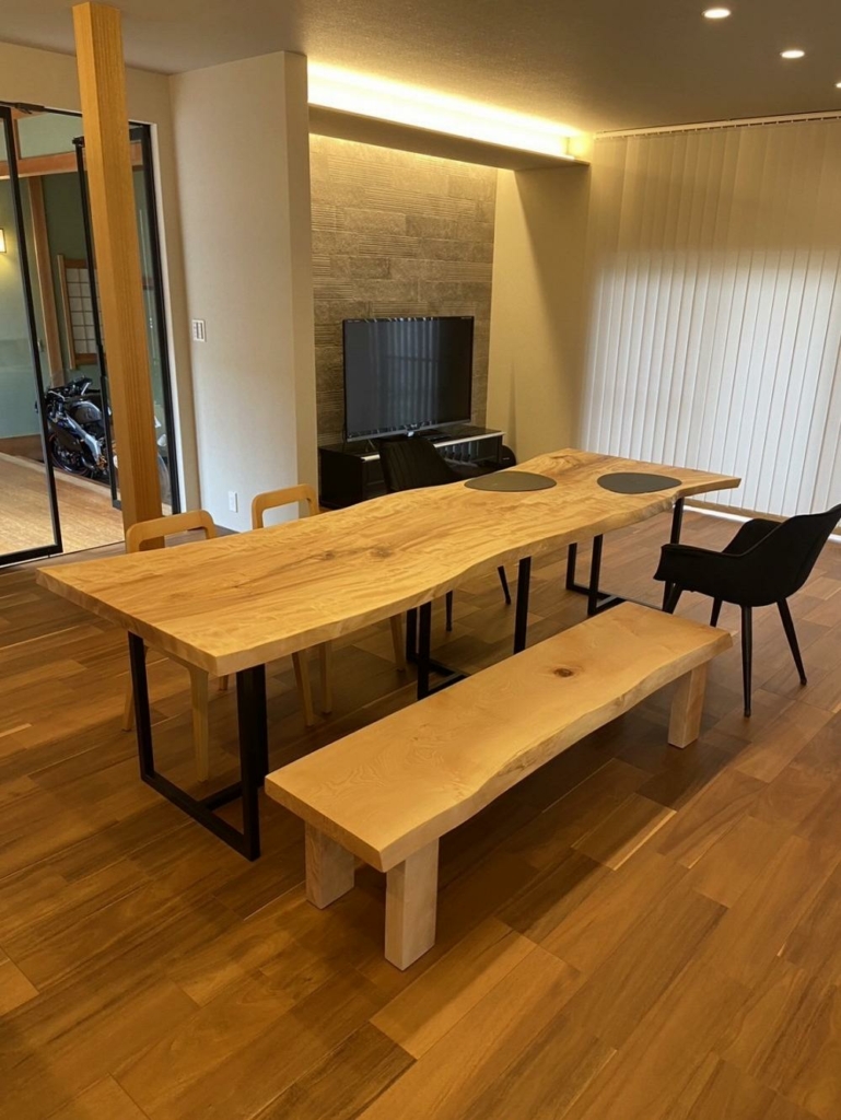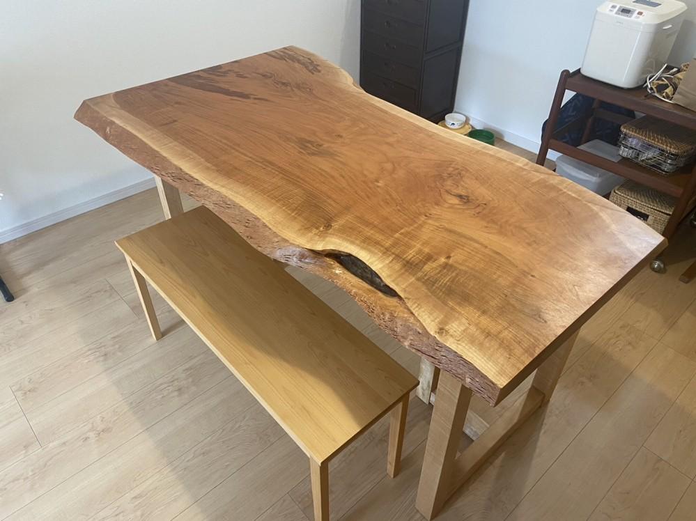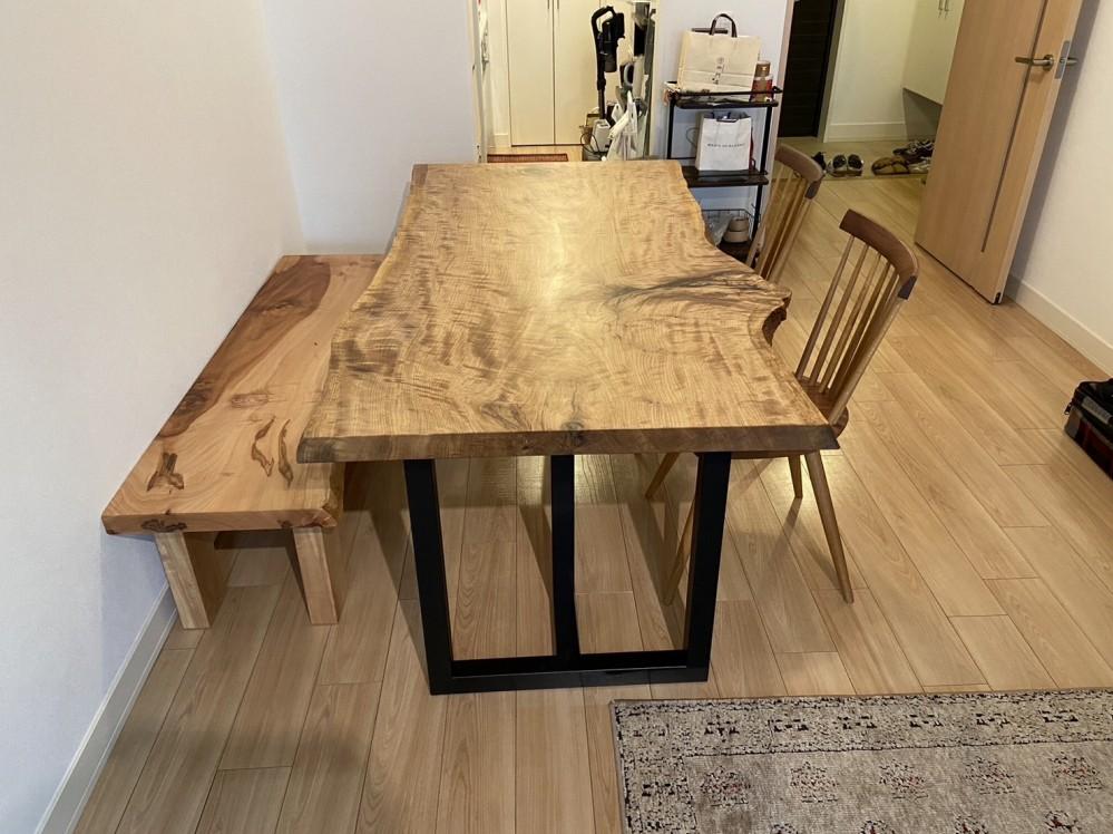 椎の一枚板テーブルセット、栃一枚板ベンチ、