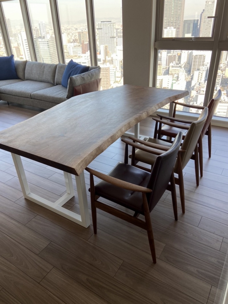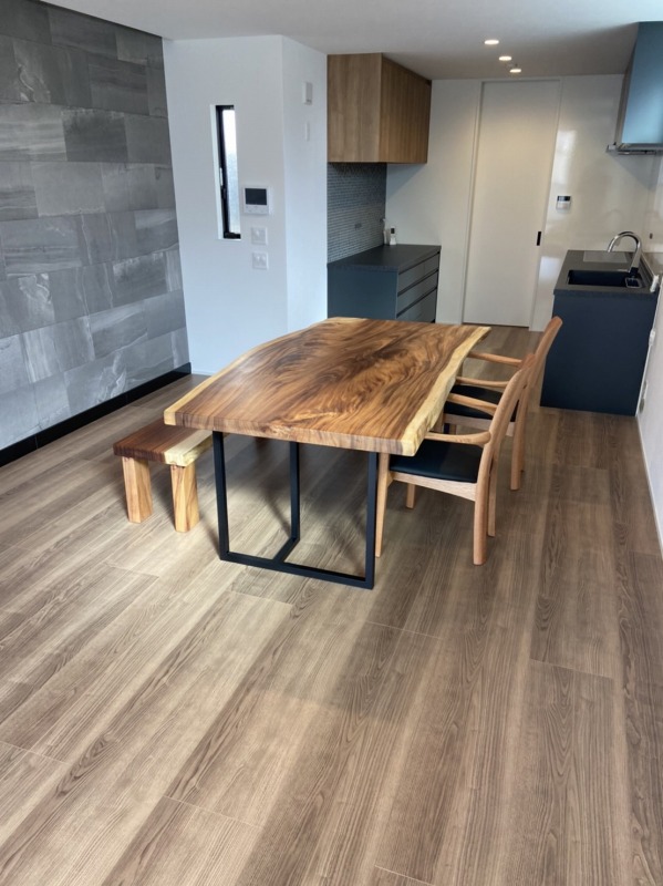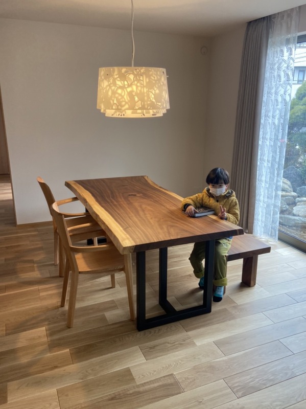 尼崎市のお客様宅へモンキーポット一枚板のダイニングテーブルとベンチ、オーク材のダイニングチェアをお届けしました^ ^