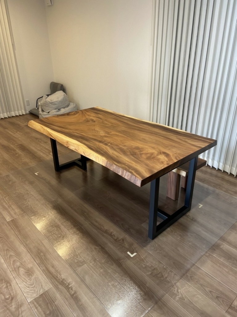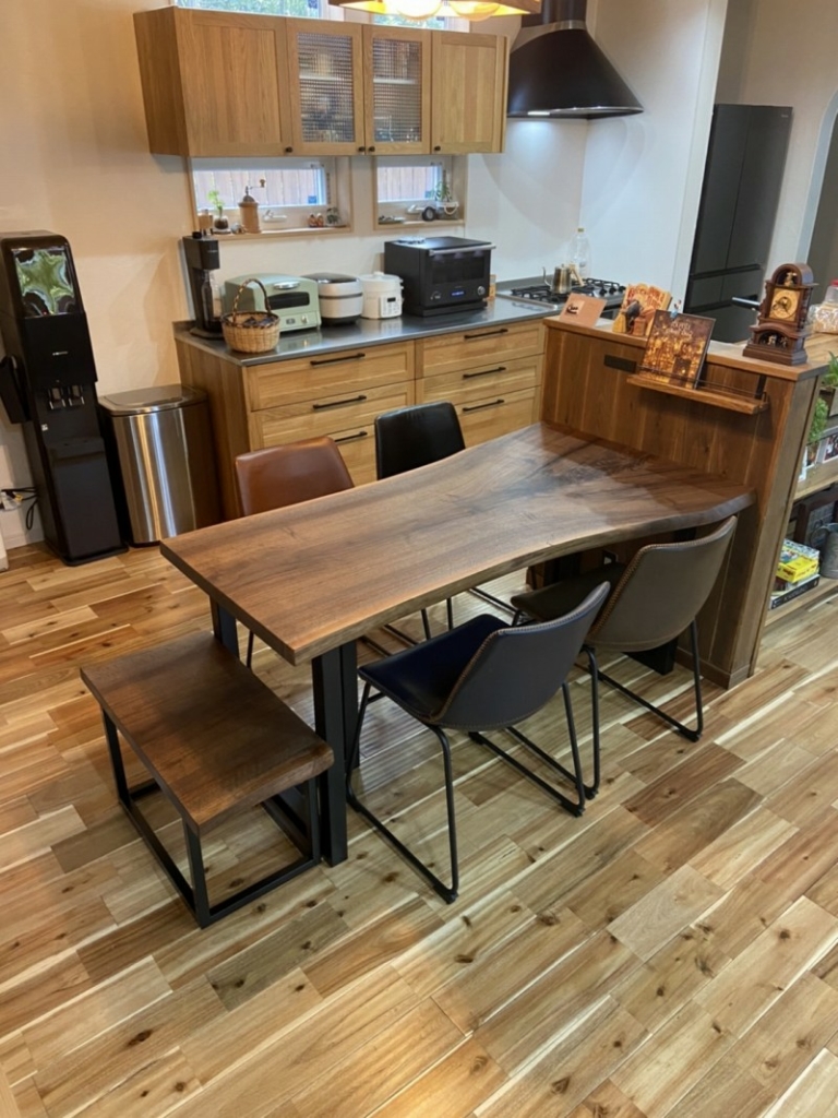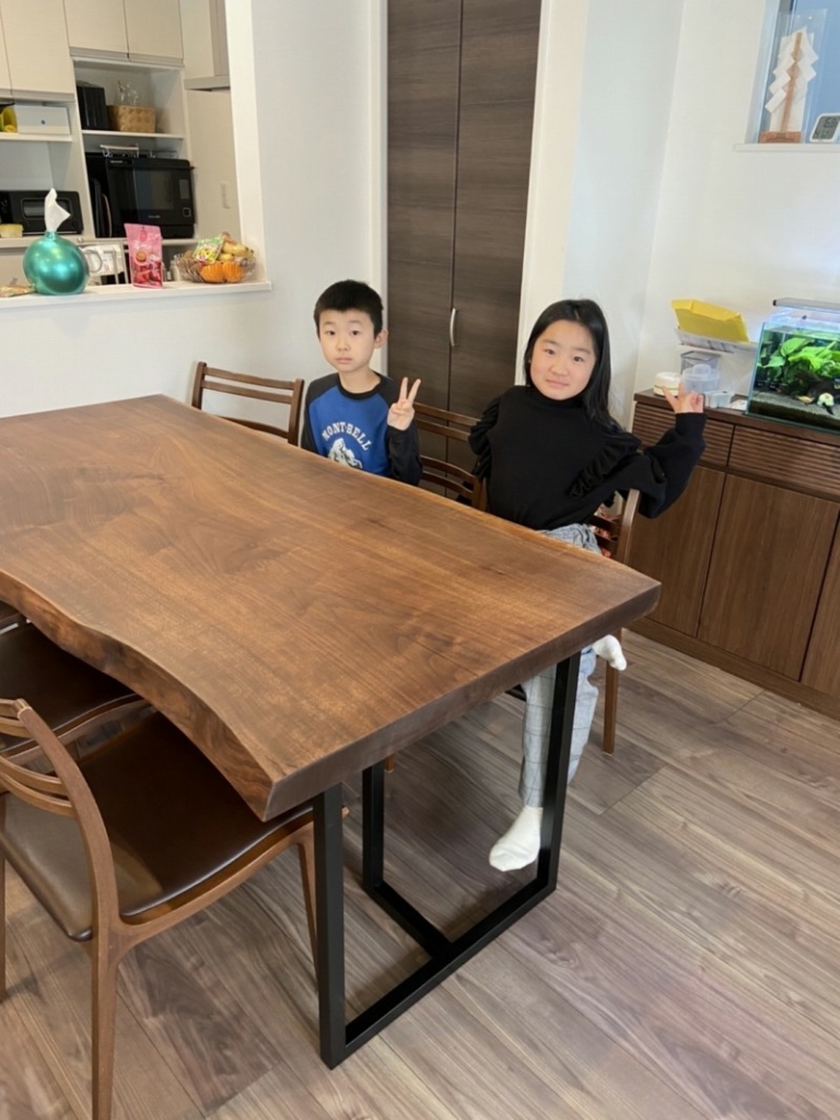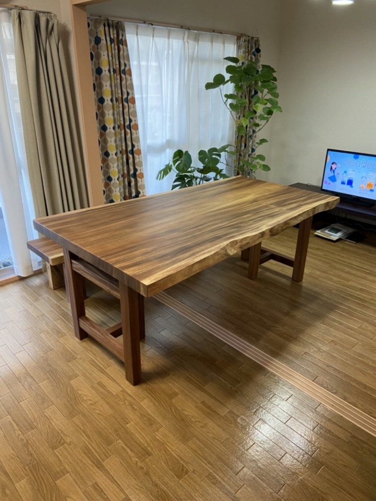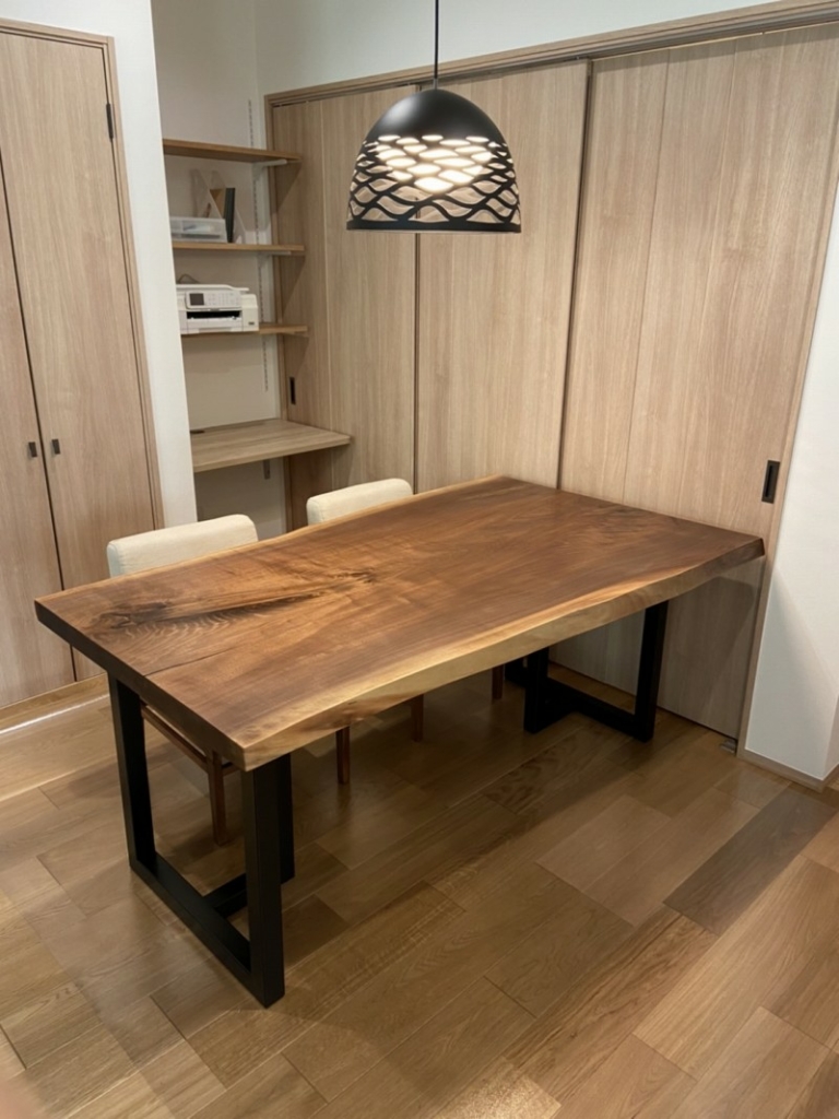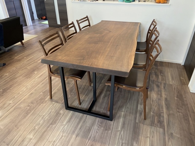 和泉市のお客様宅へアメリカンブラックウォールナット一枚板のダイニングテーブルとその板をカットしたの残りで