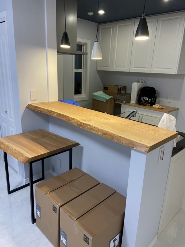 綺麗な木目のタモの一枚板をカットしてカウンターにしました