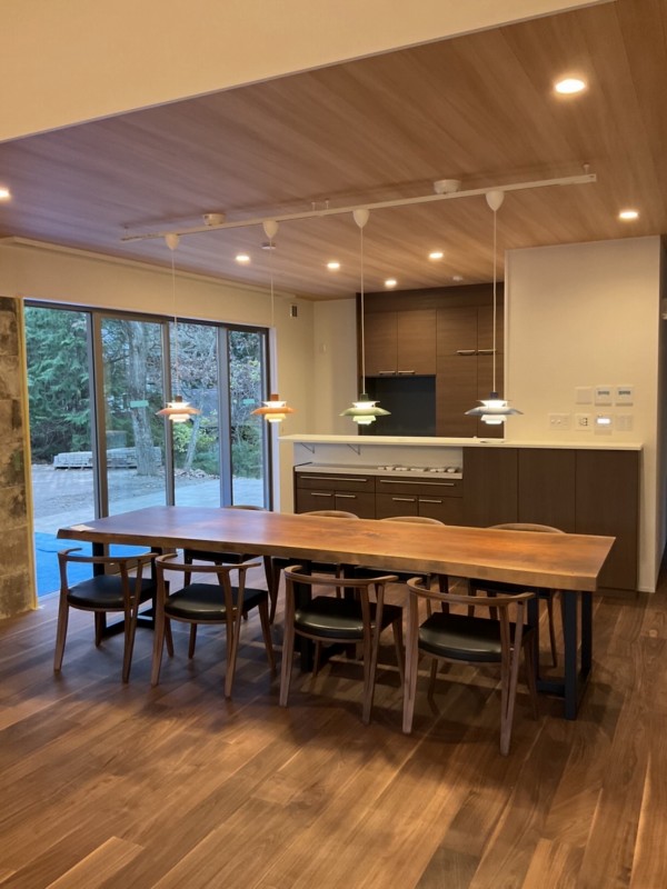 3100幅のアメリカンブラックウォールナット一枚板と同じくウォールナットダイニングチェア8脚をお届けしました^ ^