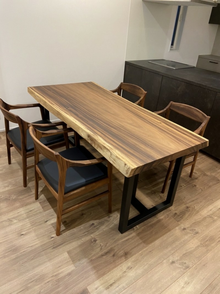 大阪港の側のマンションへケヤキの一枚板とご主人のウォールナットのダイニングチェア