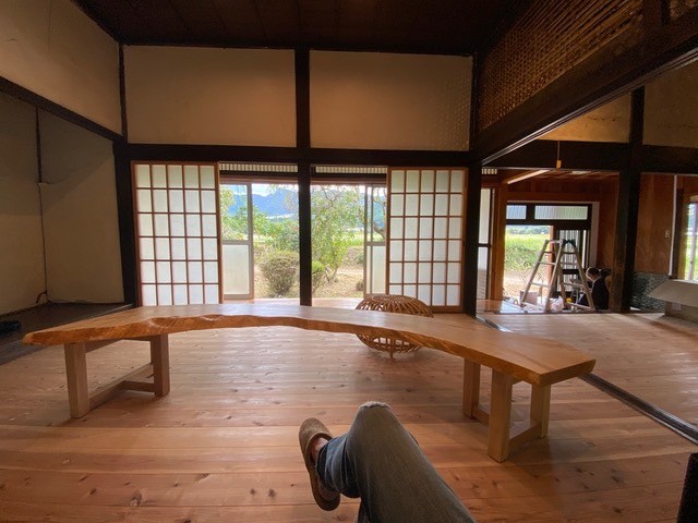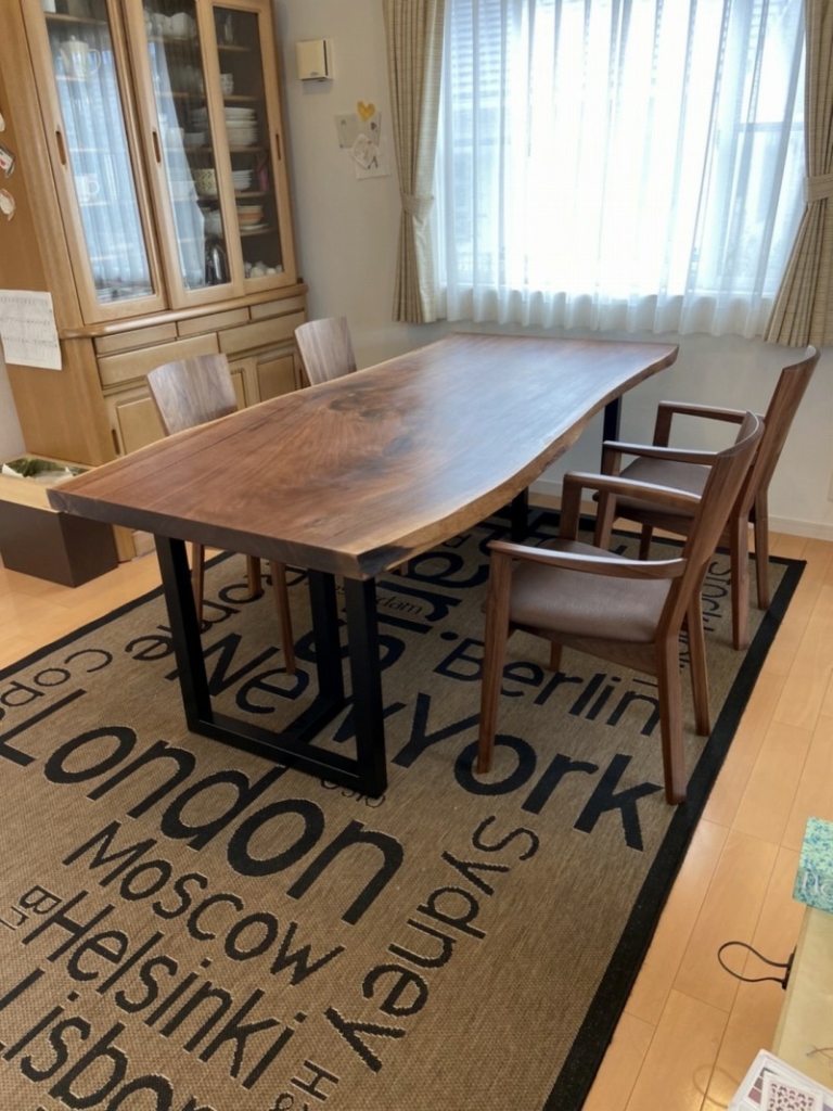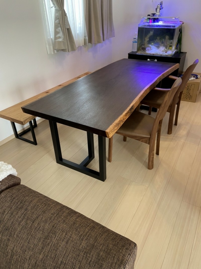 豊中市のお客様宅へ2100幅のウエンジ一枚板、楠のベンチ、ウォールナットのダイニングチェアをお届けしました^ ^