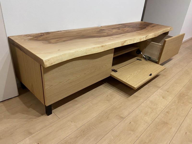 天板は栃の一枚板、本体はオーク材、脚はアイアンで見えにくい位置で桐引出しサイレントレール付き
