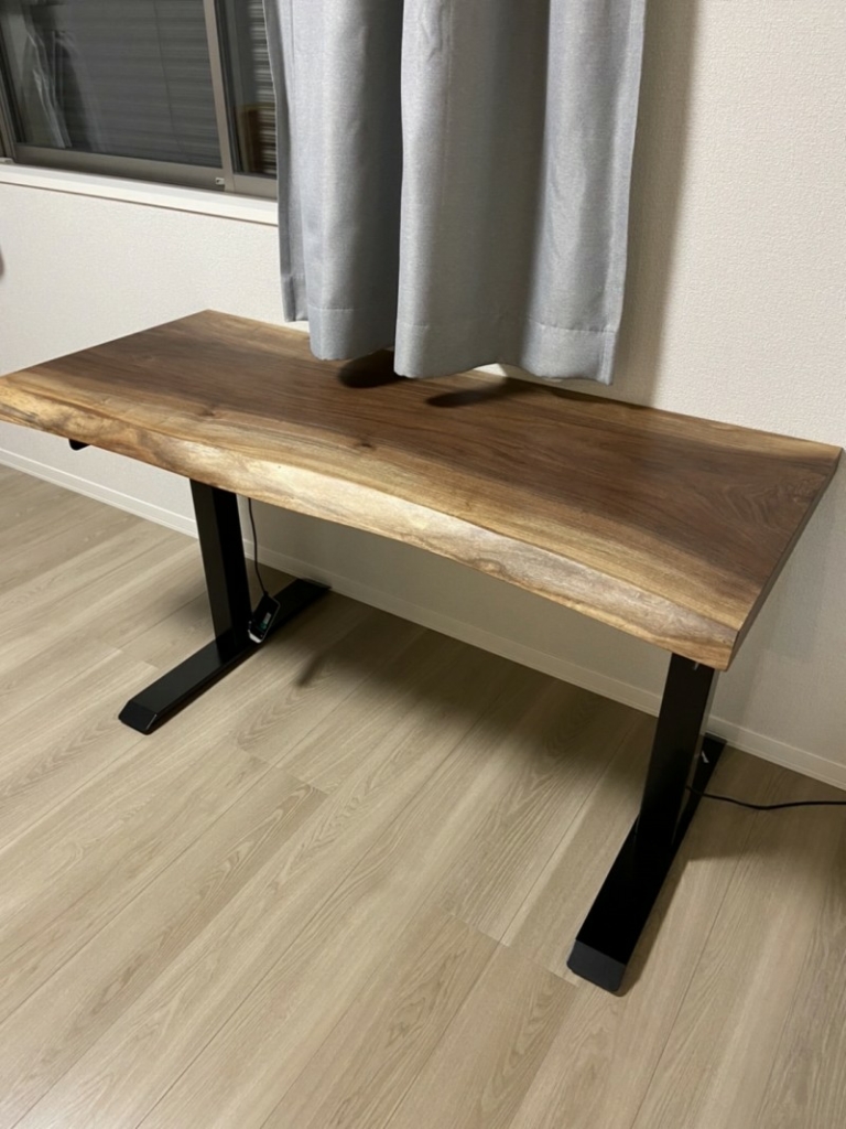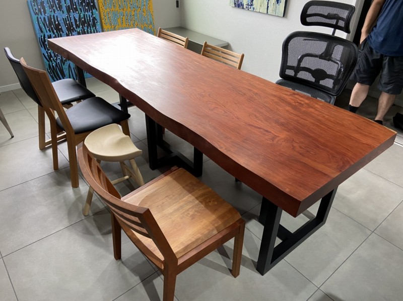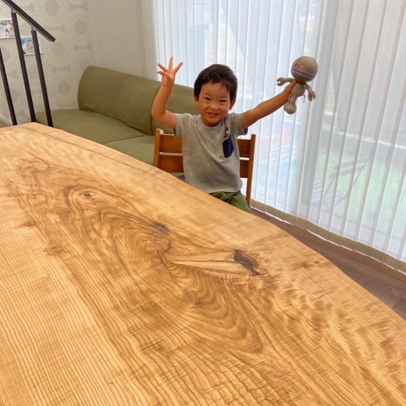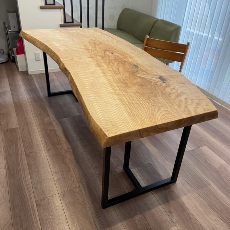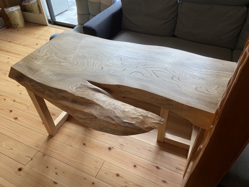 で、すぐ後にW2400とW1500のナット一枚板ないですかとお問い合わせを頂き、壁につけるのでどちらも片耳にカットしてご購入頂きました。脚は昇降式を探され一枚板の奥行きも脚に合わしました^ ^