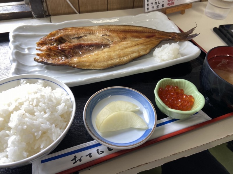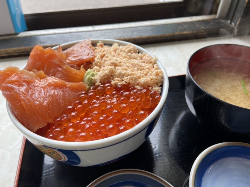 知床の漁港にて三色海鮮丼、ホッケ定食
